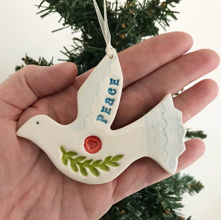 This ceramic dove decoration is made from white earthenware clay and finished with a loveheart and lace design. This has been fired in an electric pottery kiln, so it is nice and strong. It measures 9cm x 7.5cm and hangs from a cream organza ribbon. It is glazed on the front and left plain on the back.