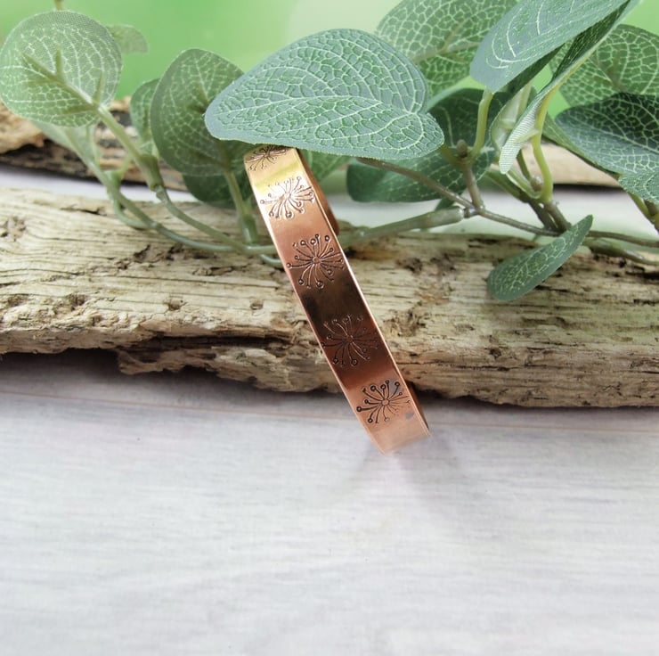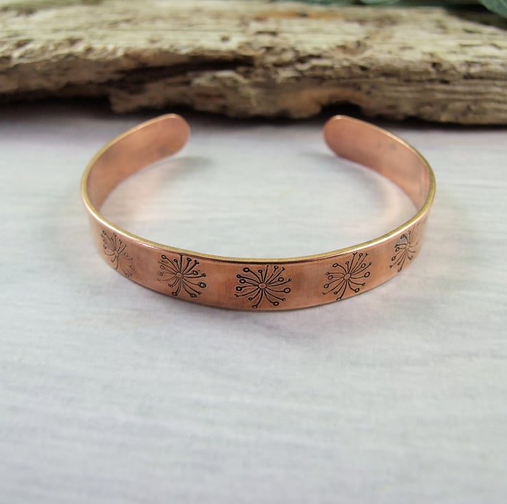 Copper Cuff Bangle stamped Seed Heads. Medium fit to suit 6-7 inch wrist.