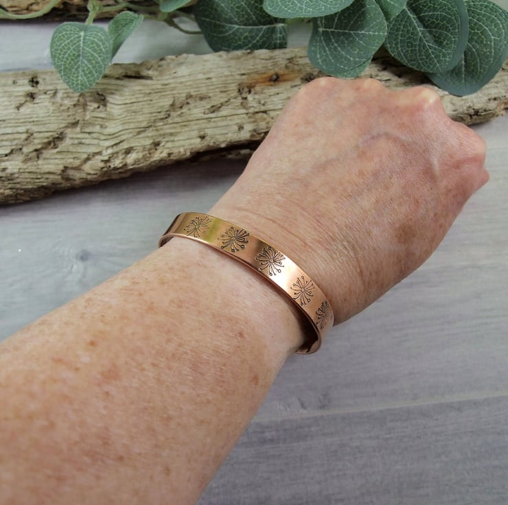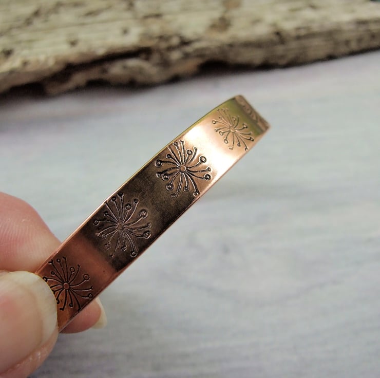 I have made the bangle from 1.3mm thick solid pure copper shaped and forged by hand hand stamped with the seed heads, creating using steel stamps. Polished antiqued finish.