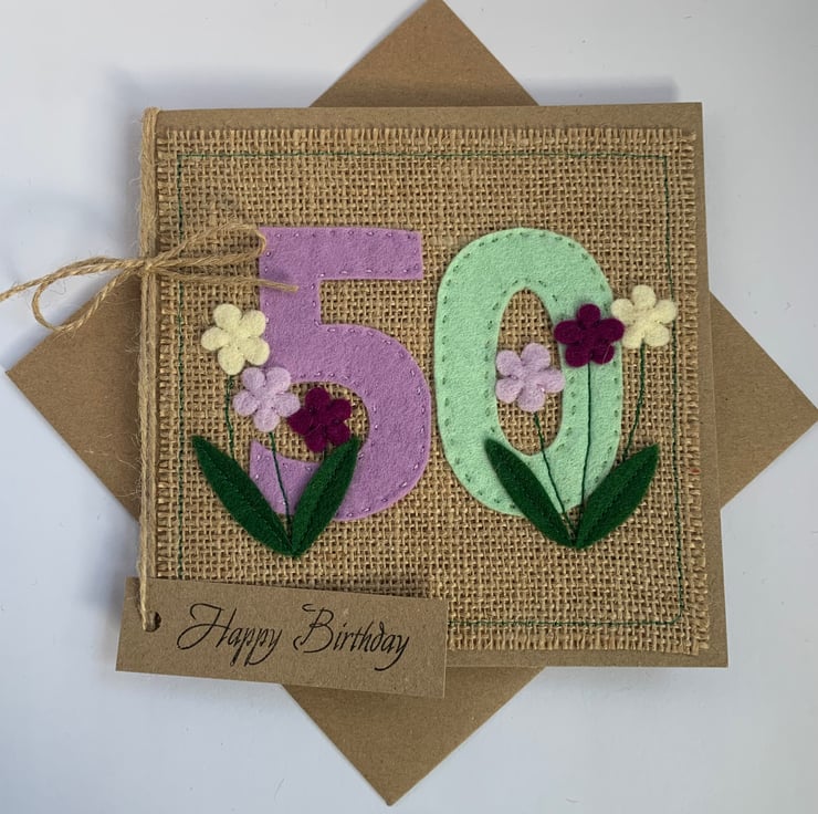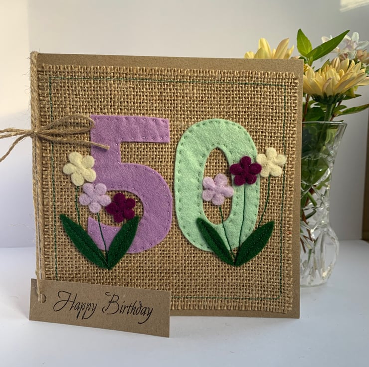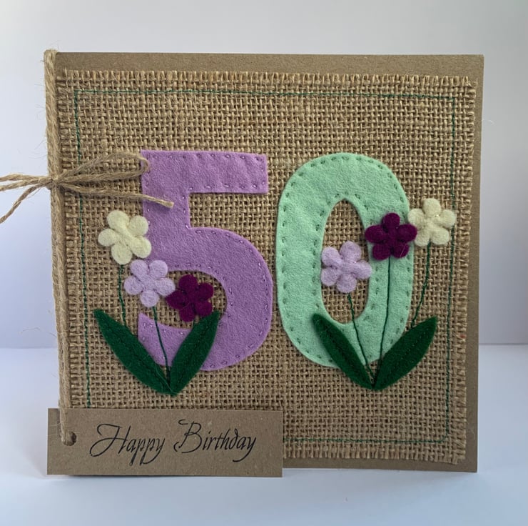 A unique handmade card for a special birthday. The numbers for this 50th birthday card are hand cut from pale green and lilac acrylic felt and hand sewn to a hessian background. Flowers, hand cut from wool felt, in contrasting colours are added to decorate the card.