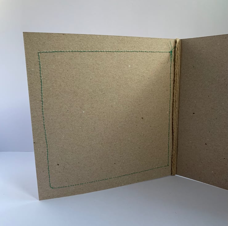 The hessian is machine stitched, using a contrasting thread, onto a plain brown recycled card. This stitching is visible on the inside of the card.