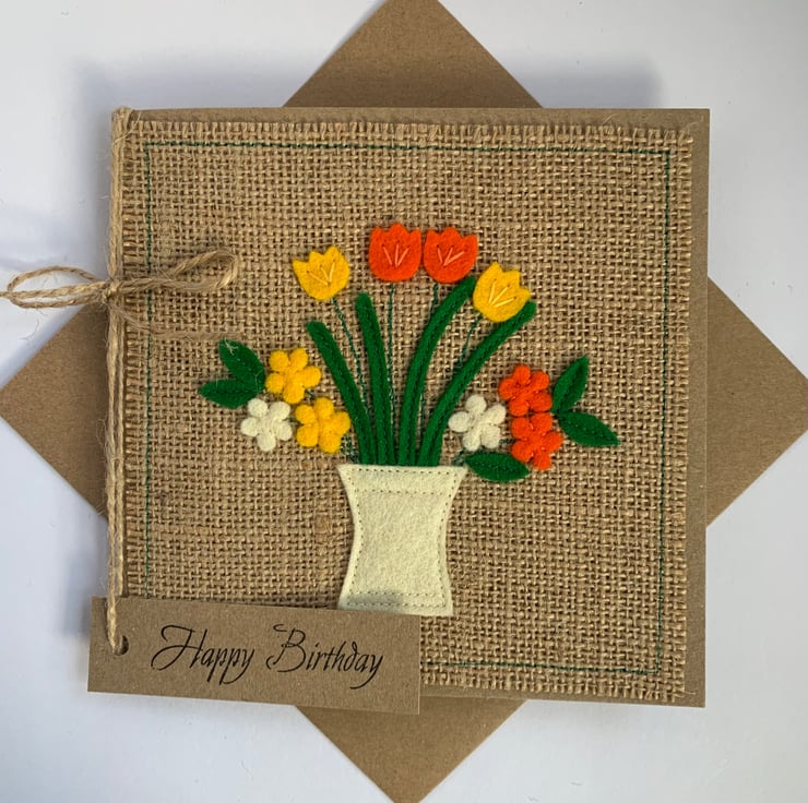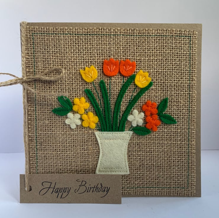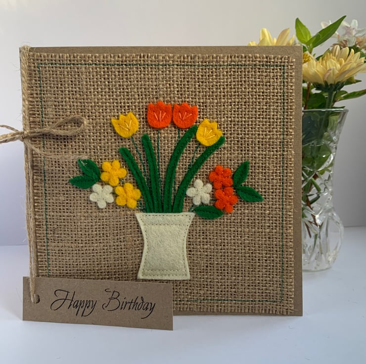 This greetings card is decorated with a cream vase of bright orange and yellow flowers. The decoration is hand cut from 100%wool felt. It is then sewn by hand and machine onto a hessian background.