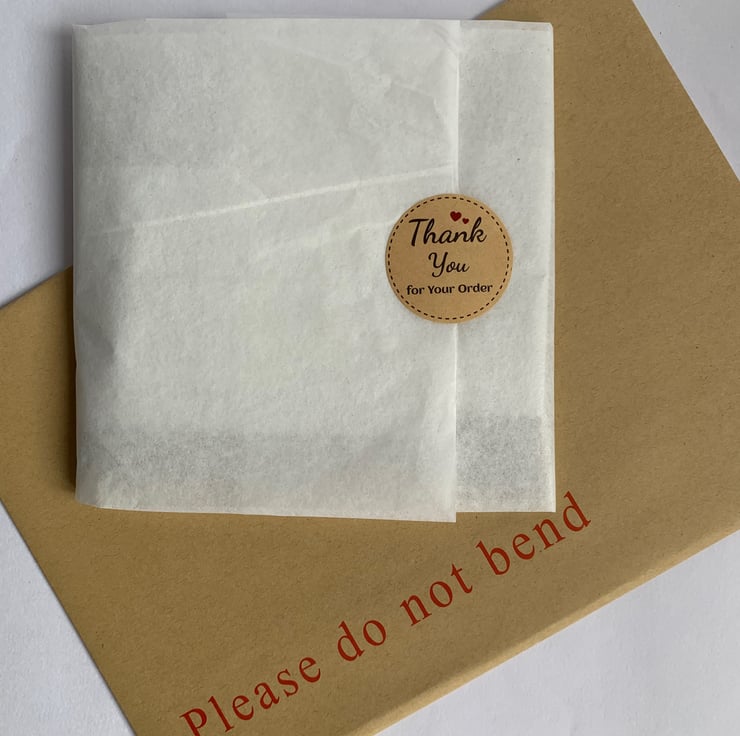 The card measures 6x6 inches and is supplied with a matching envelope. For delivery the card will be wrapped in tissue paper and posted, first class, in a boarded envelope for protection.