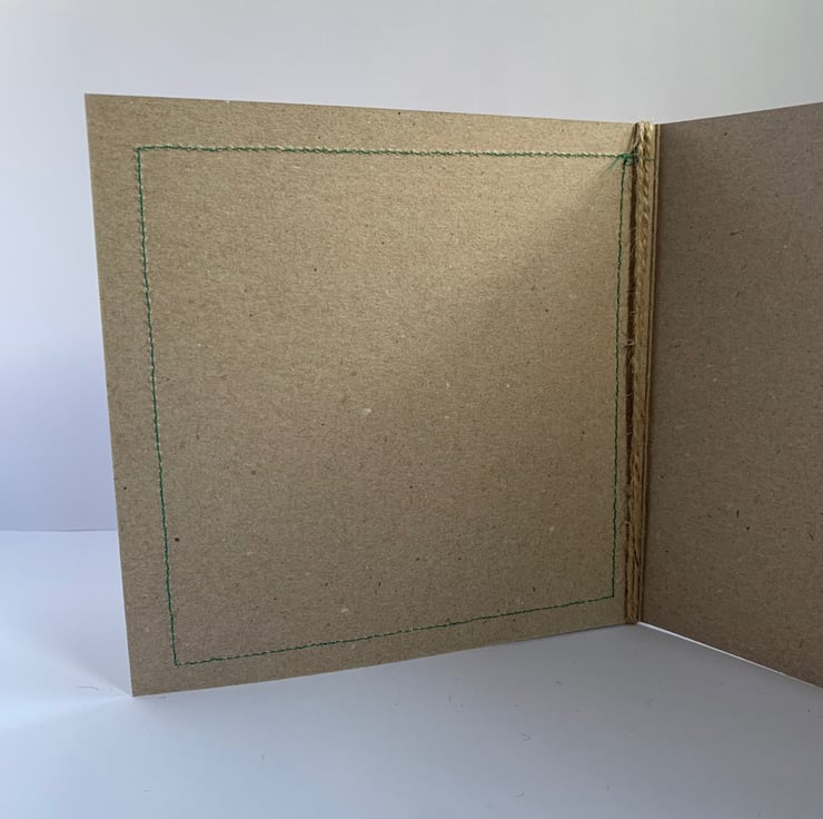 The hessian is machine stitched, using a contrasting thread, onto a plain brown recycled card. This stitching is visible on the inside of the card.