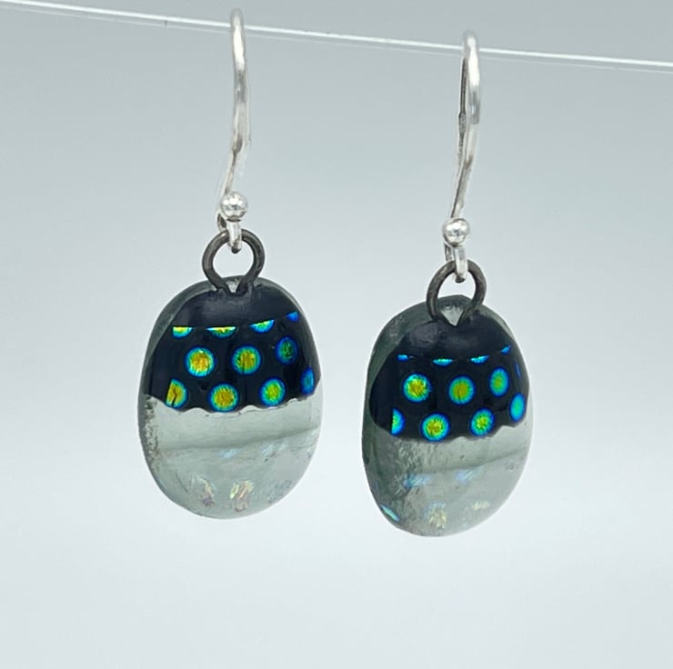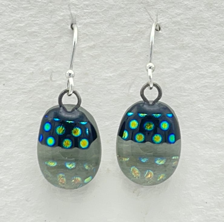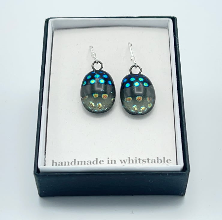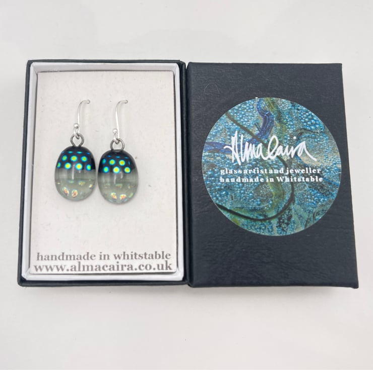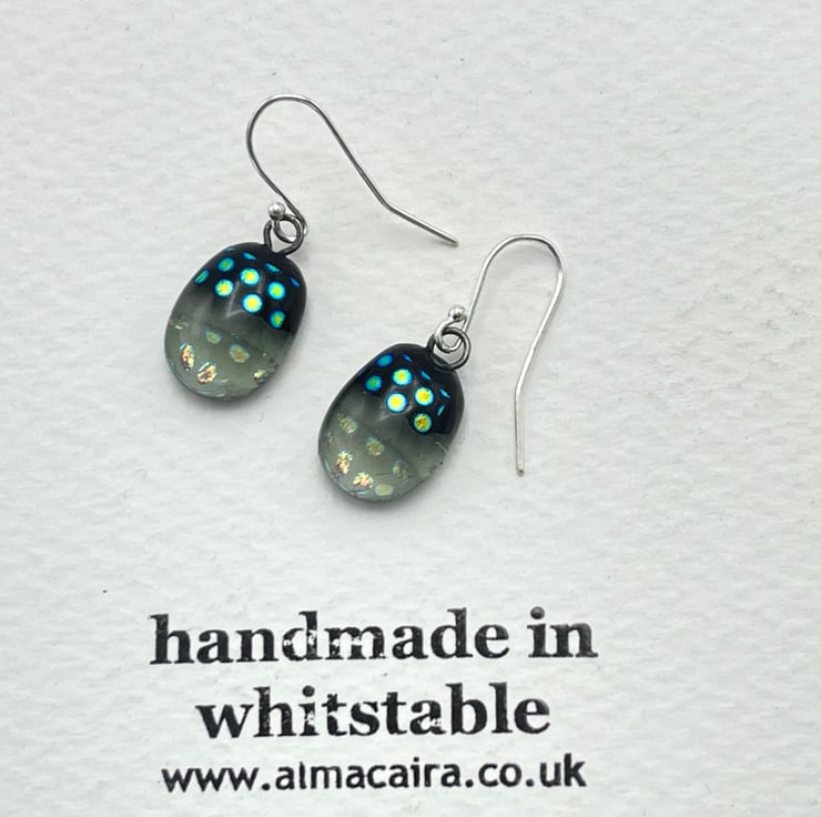 Created from layered Bullseye glass in my Whitstable garden studio. Sterling silver ear wires. Made with transparent grey and dichroic glass.