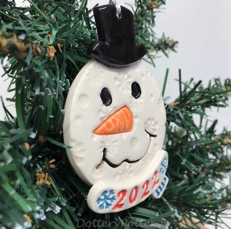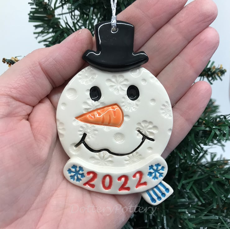 This little snowman decoration has been made from white earthenware clay. I designed his face to have a little wonky smile! It has been decorated with pattern and then glazed. It has been fired twice and finished with a glossy clear glaze. Plain on the back. It measures 9cm x 5.5cm x 1cm deep deep and hangs from a metallic silver string.