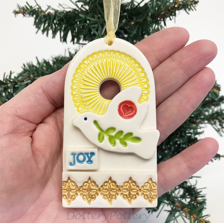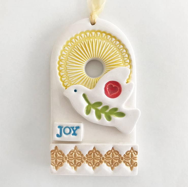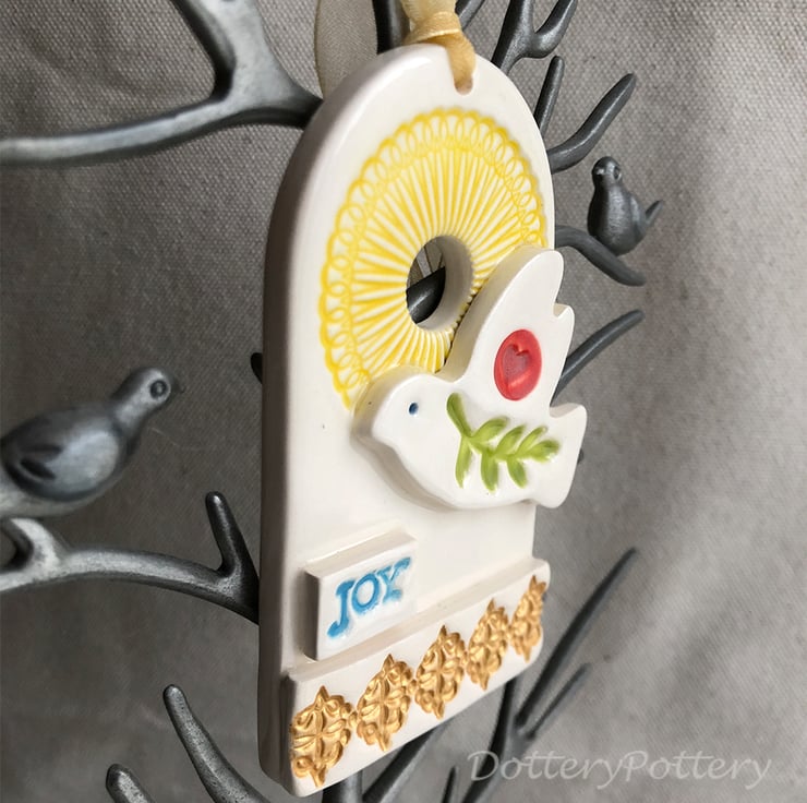 This large Christmas decoration features adove and the word JOY. It has a gold metallic feature along the bottom. It has been fired twice and finished with rich, glossy glazes. Glazed on the front only. It measures 9cm x 5cm x 1cm deep and hangs from a gold coloured organza ribbon.