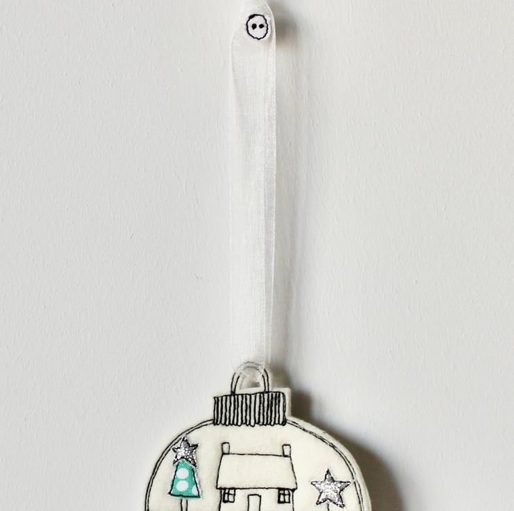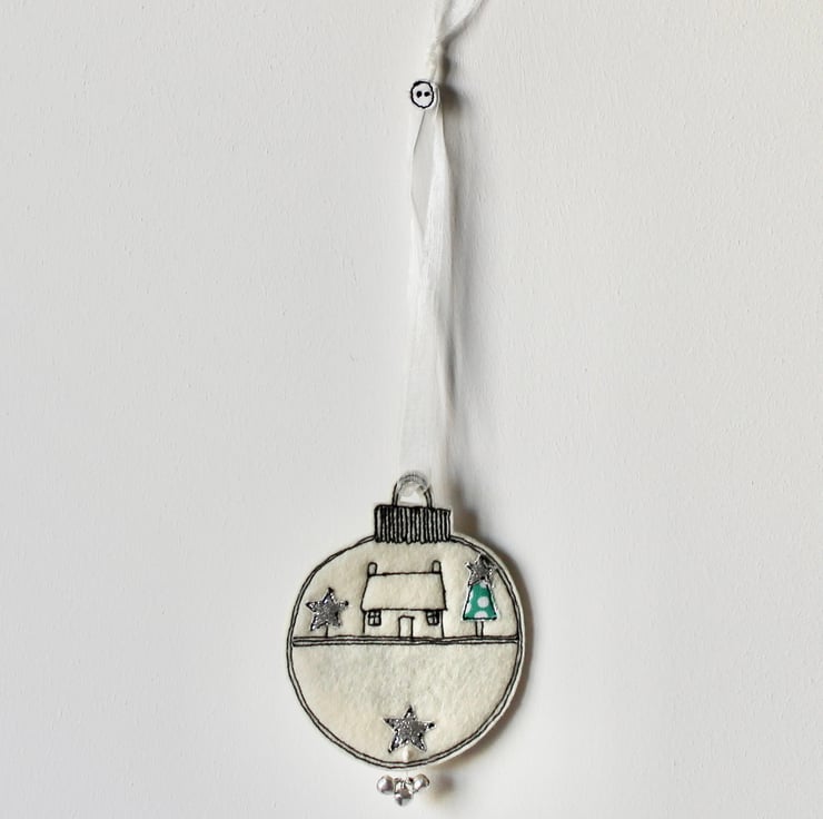 This bauble is created using a double layer of 100% cream wool felt, dotty green cotton cloth, glitter cloth, free hand machine embroidery with three bells and a chiffon ribbon to finish it off.