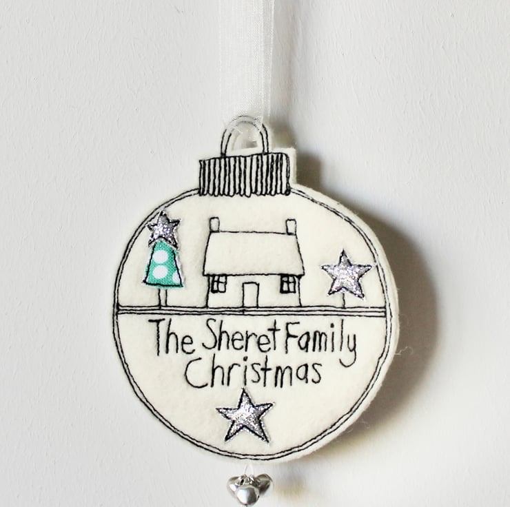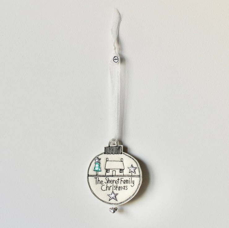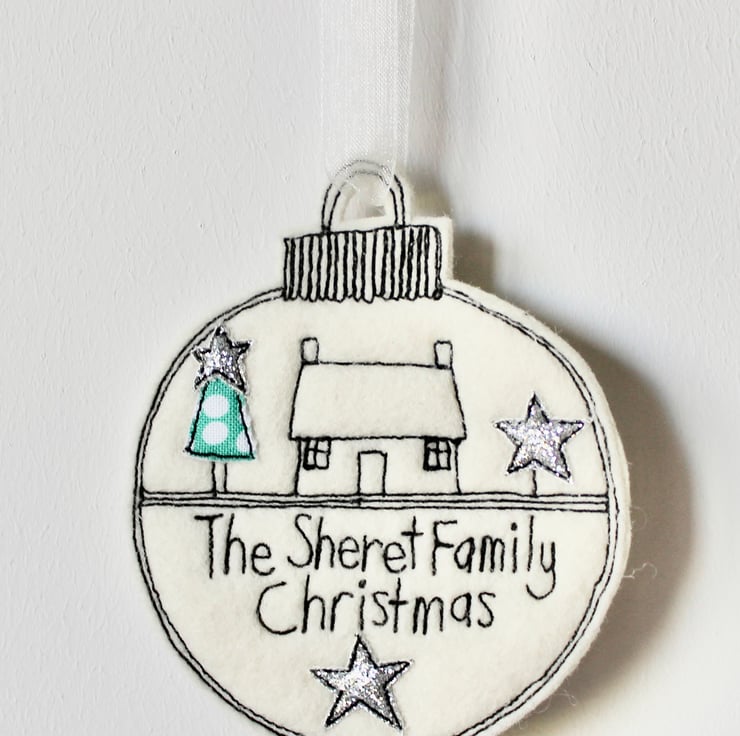 On a wool felt bauble, a little house sits, with a Christmas tree, three stars and your chosen family name; making a very special personalised bauble for a Christmas tree.