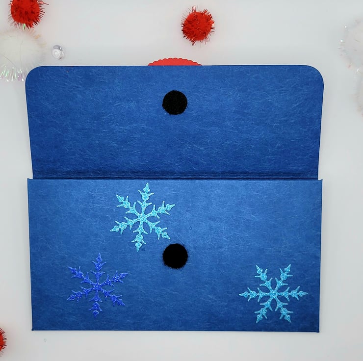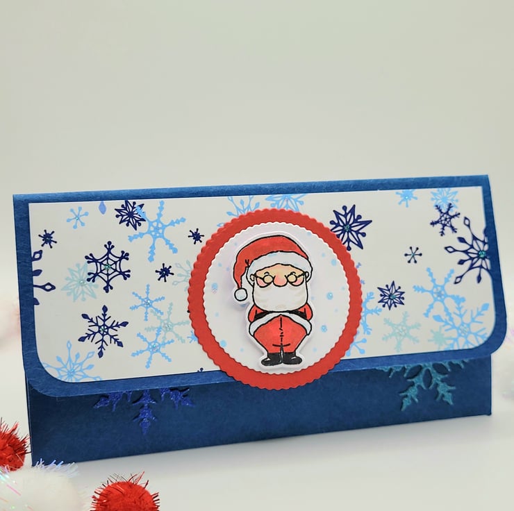 This is made from quality felted style festive blue card and has also been decorated with white and blue snowflake patterned card. Die cut snowflakes in non-shed glitter card and a stamped and hand coloured Santa. The inside has a matching white card panel with HO HO HO stamped and some tiny snowflakes.