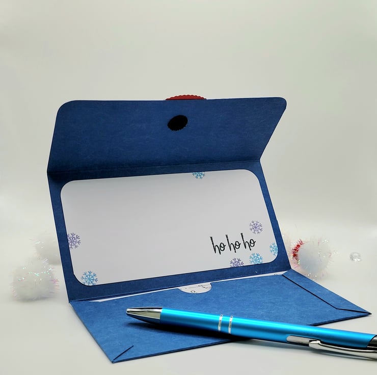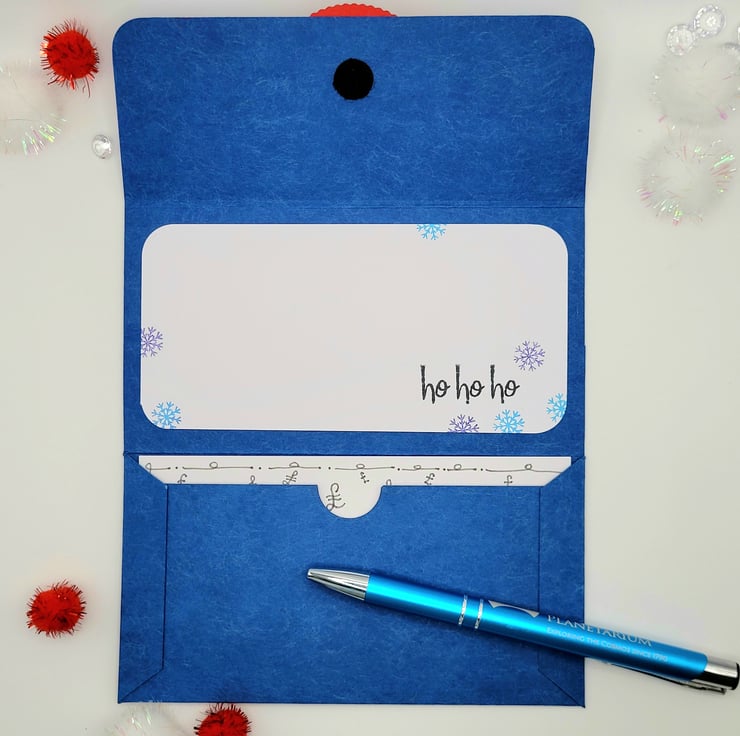 Closed the gifting greeting card measures 8 cm x 15 cm and when fully unfolded is 15 cm x 21 cm. The fastener is hook and loop and it has been sized for UK bank notes. Alternatively there is ample space for a gift card or voucher.