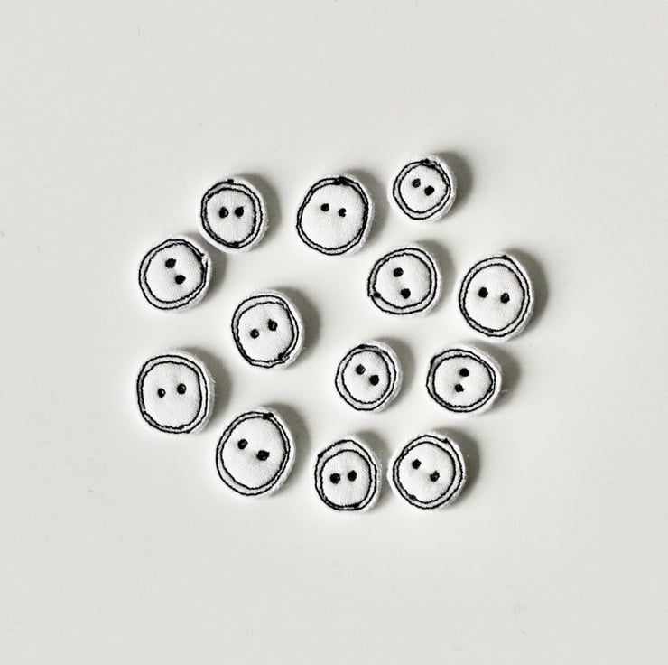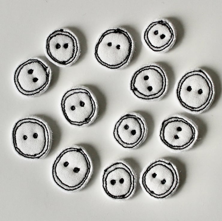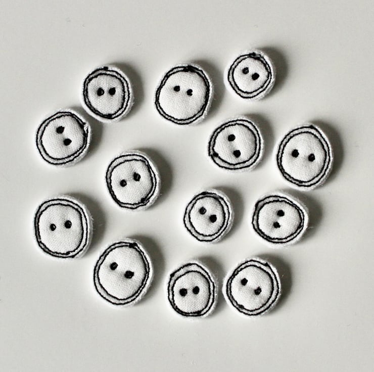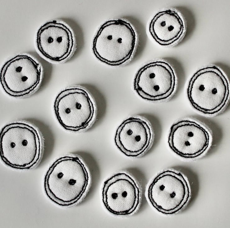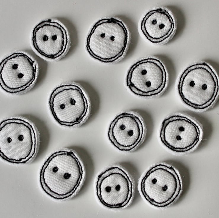 Fabric buttons are created using cotton cloth, 100% wool felt and sewn using freehand machine embroidery. They are cut out by hand using a very sharp pair of scissors.