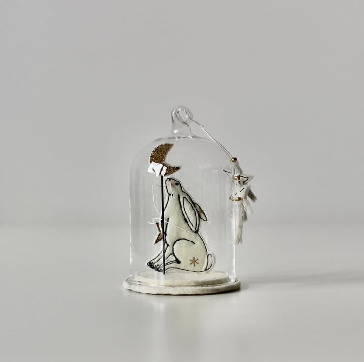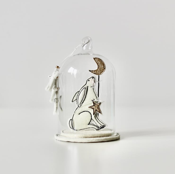Moon gazing hare glass dome is created using free hand machine embroidery, cotton cloth, glitter cloth, wire and 100% wool felt.