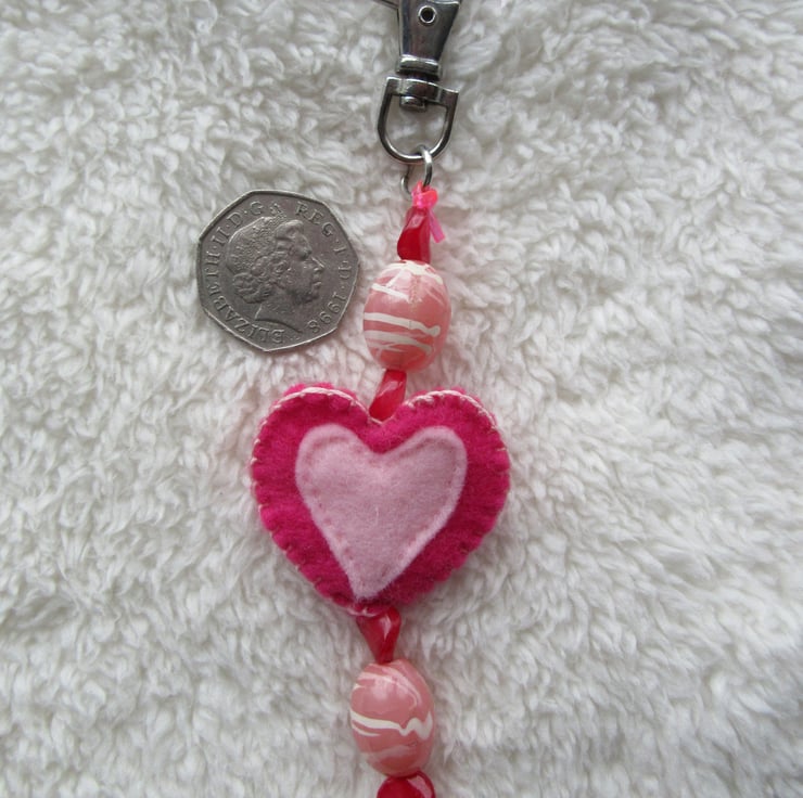 A cute pink heart bag charm, a stocking filler gift for girls that can be used all year round.
