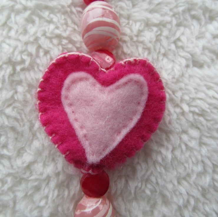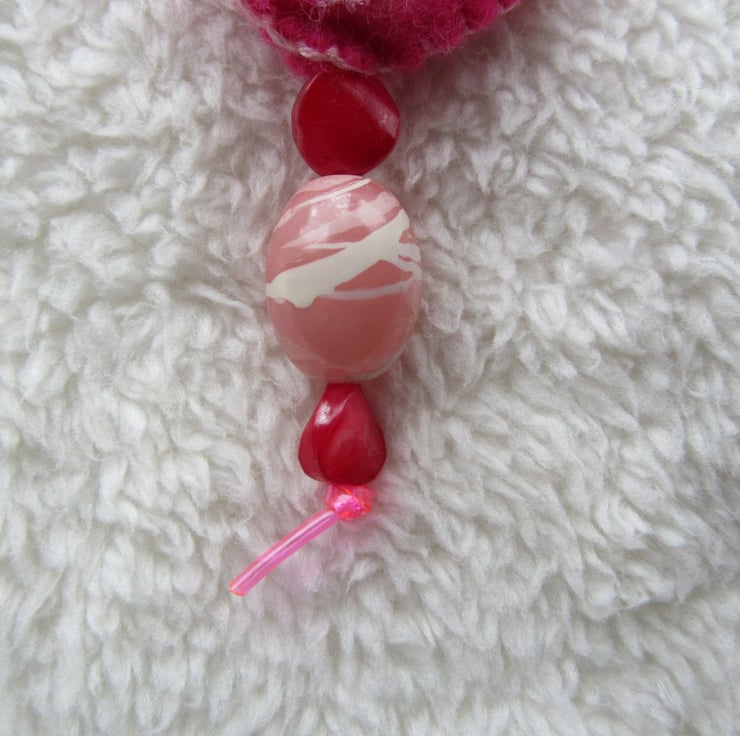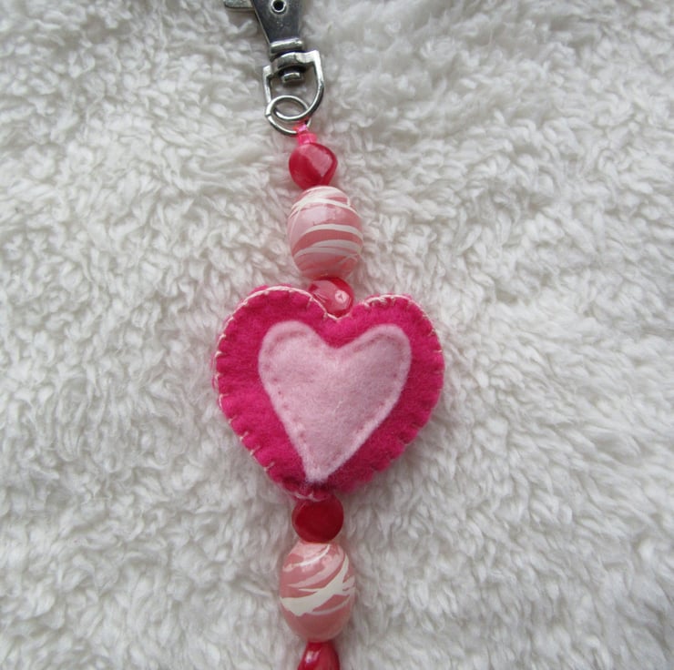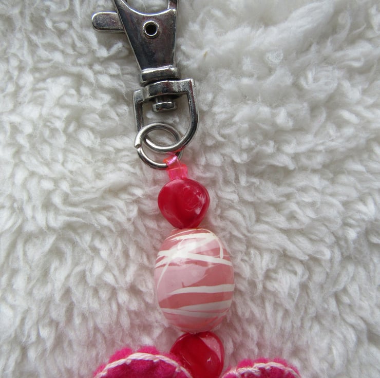This bag charm is made from 2 tones of pink felt, hand-stitched onto a pink plastic cord. With pink beads in 2 sizes above and below. Because all of my bag charms are made from leftover pieces of felt and saved/reused beads no 2 will ever be the same.