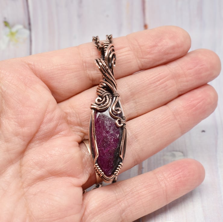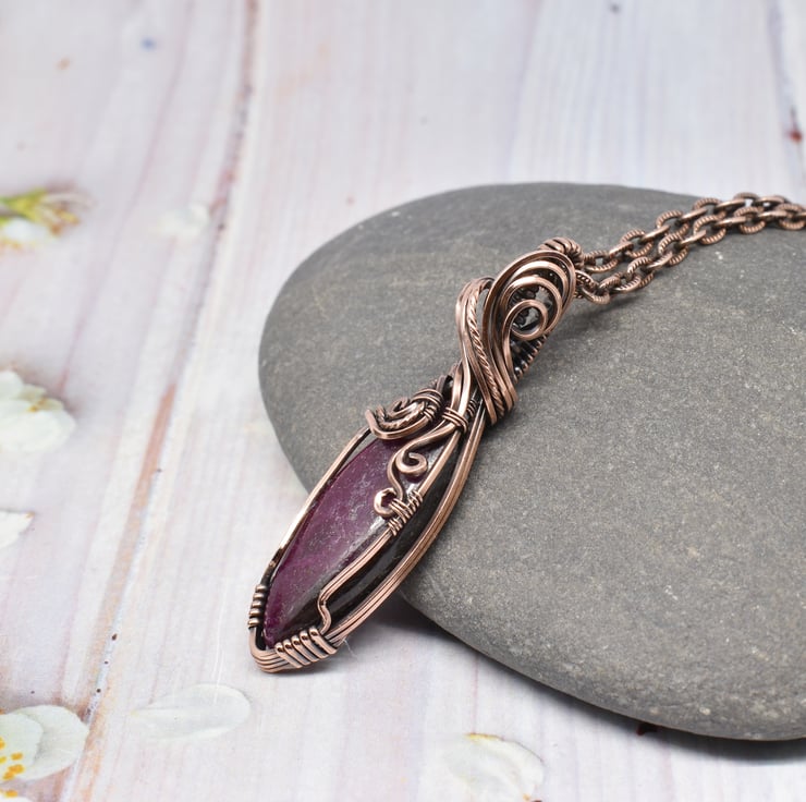 This pretty pendant is handmade using solid copper wire, a marquise shaped ruby cabochon and the wire wrapping technique.