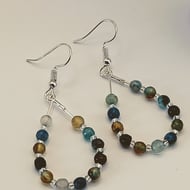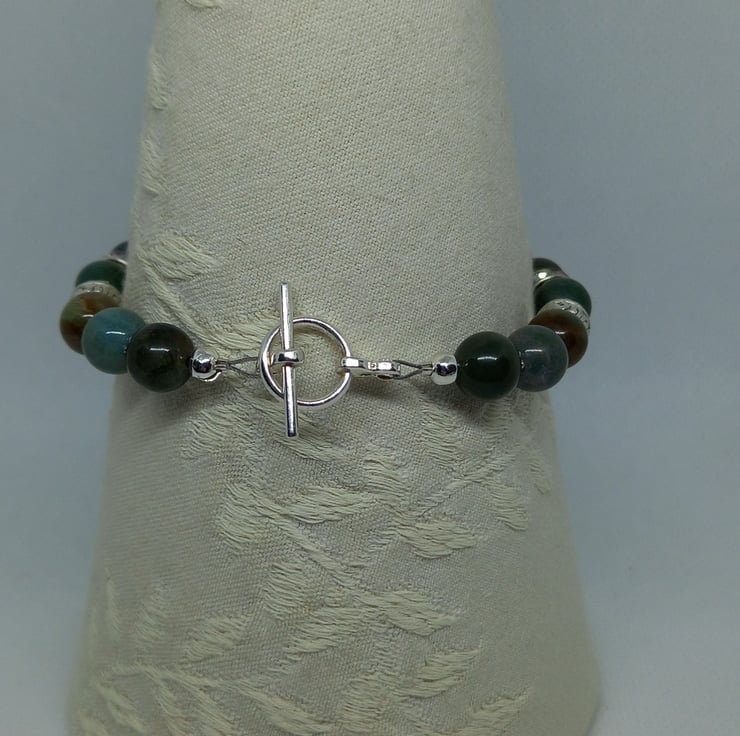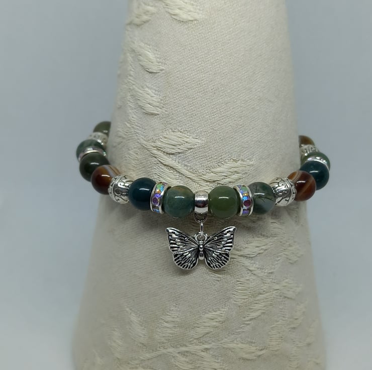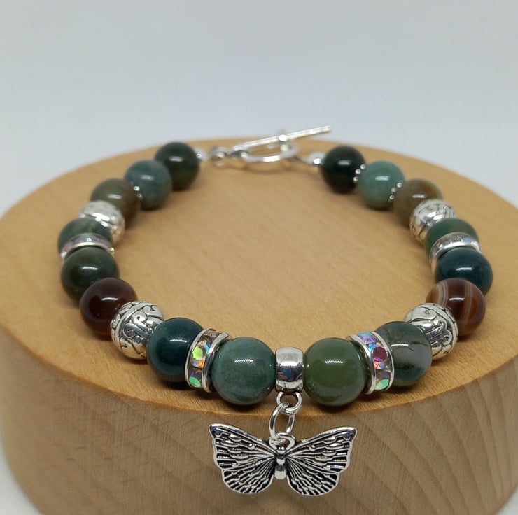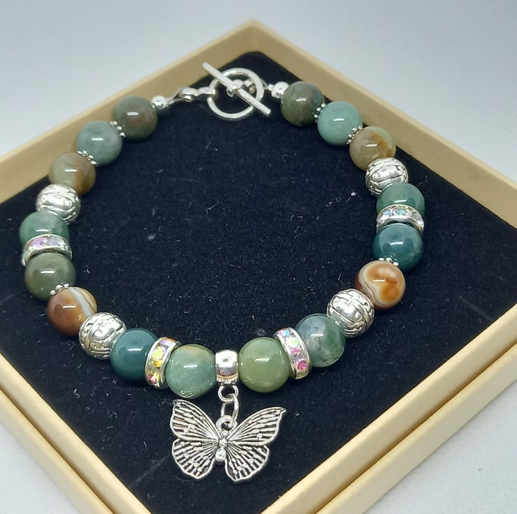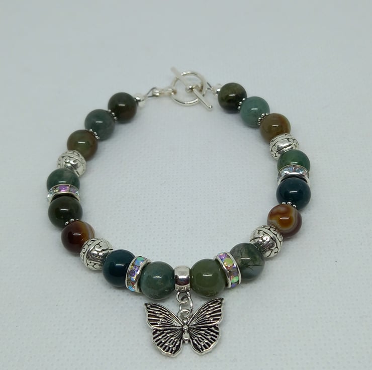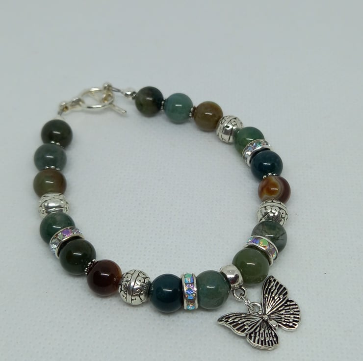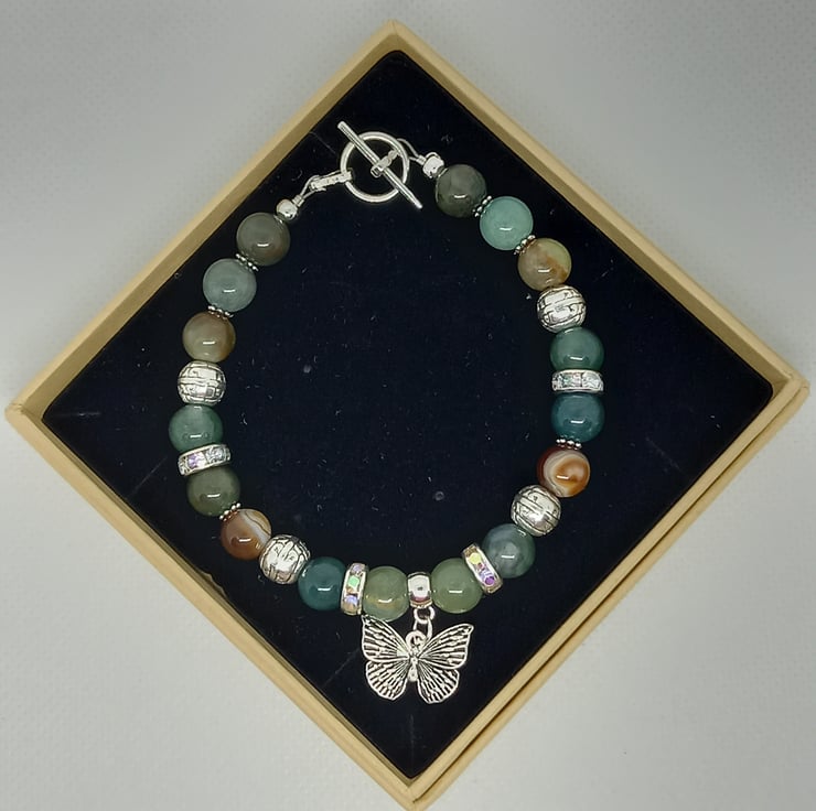 This pretty bracelet is a slight variation on a previous bracelet I made and here it features 8mm indian agate beads in varying shades of green, together with some agate beads in a rich brown colour for a spot of contrast. There are also diamante spacers, tibetan silver beads and daisy spacers. A delicate butterfly charm hangs from a silver plated charm bail and the bracelet fastens with a simple silver plated toggle clasp. All the beads are securely threaded onto 49 strand beading wire for flexibility and finished with good quality crimps. Bracelet length is 8 inches.