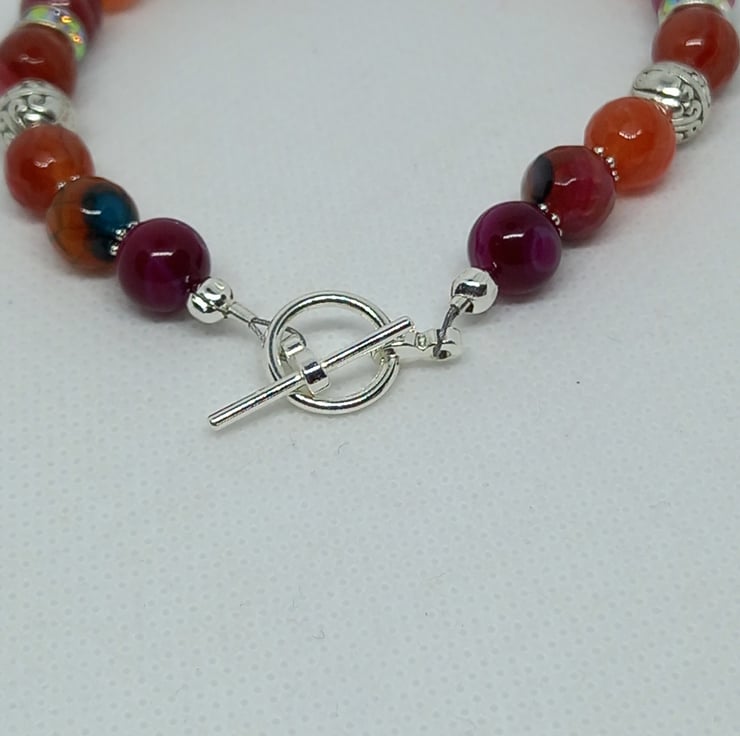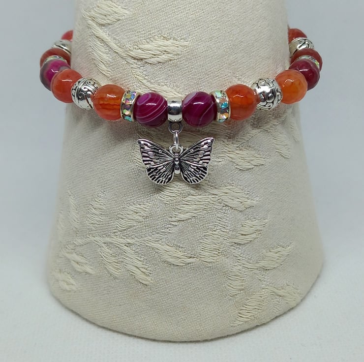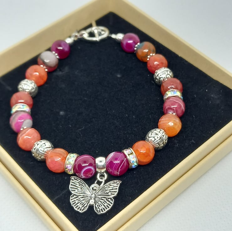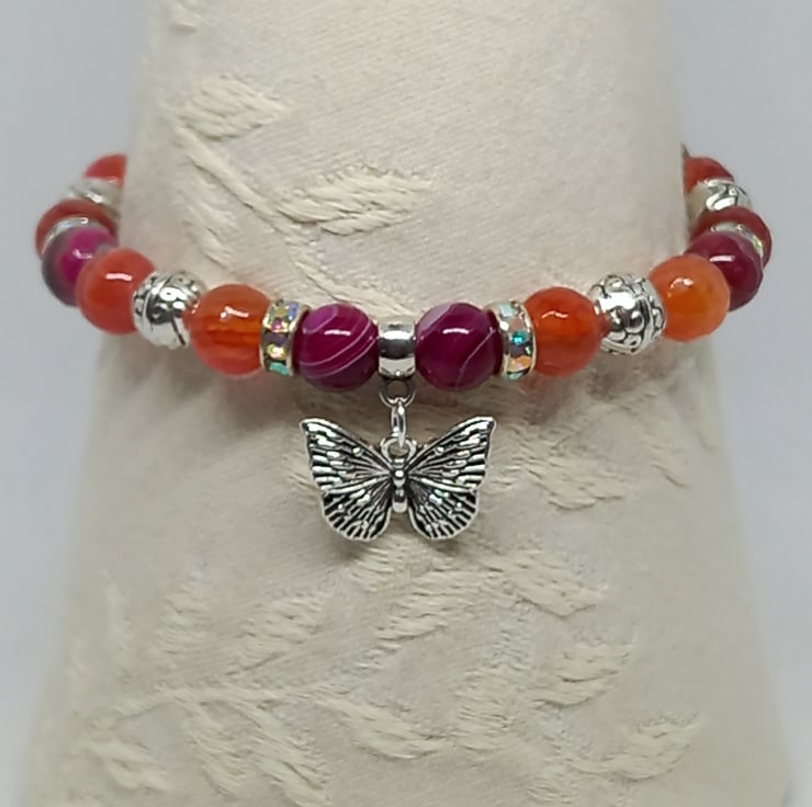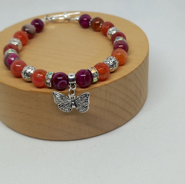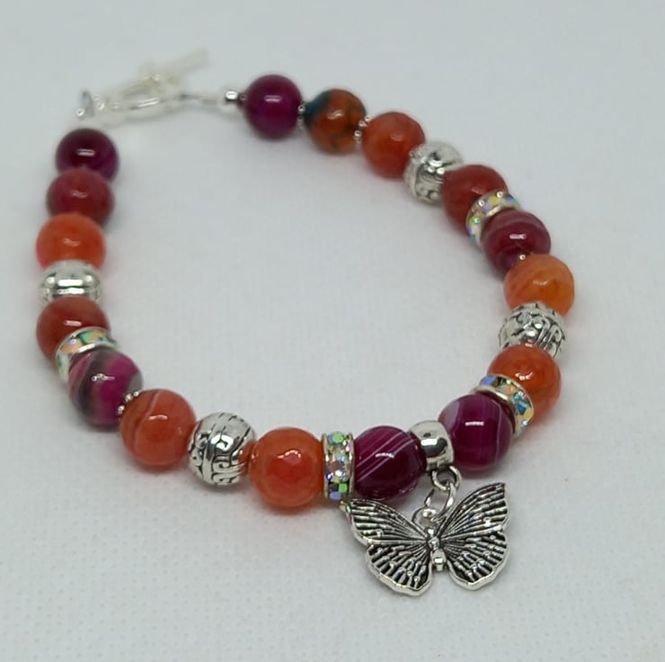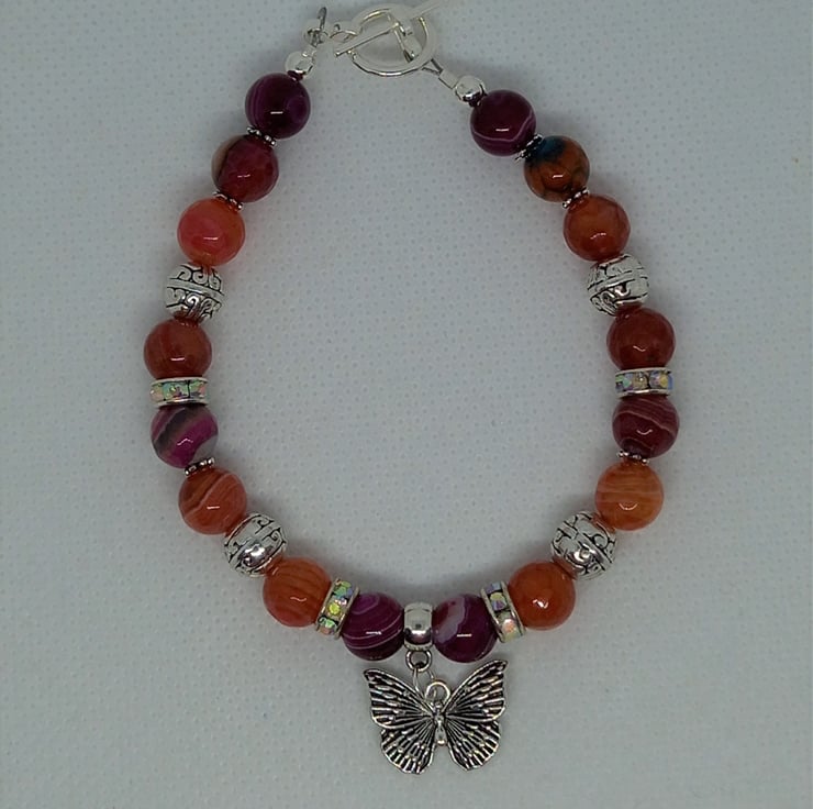 In jazzy shades of cranberry and orange, this pretty bracelet is composed of 8mm agate beads, with diamante spacers, tibetan silver beads and daisy spacers. A delicate butterfly charm hangs from a silver plated charm bail and the bracelet fastens with a simple silver plated toggle clasp. All the beads are threaded onto strong 49 strand beading wire for flexibility, and finished with good quality crimps. Bracelet length is 8 inches.