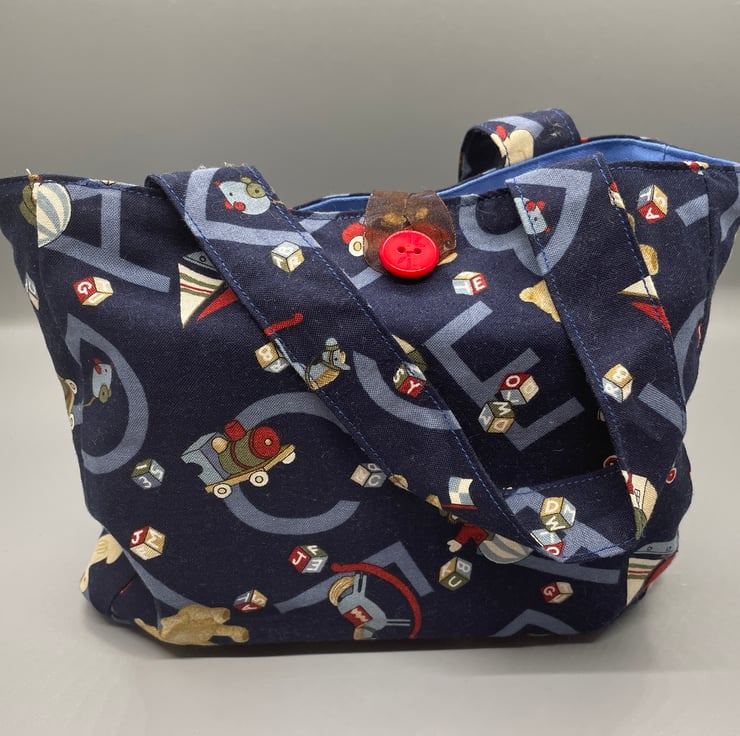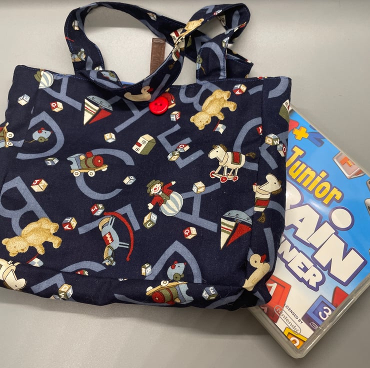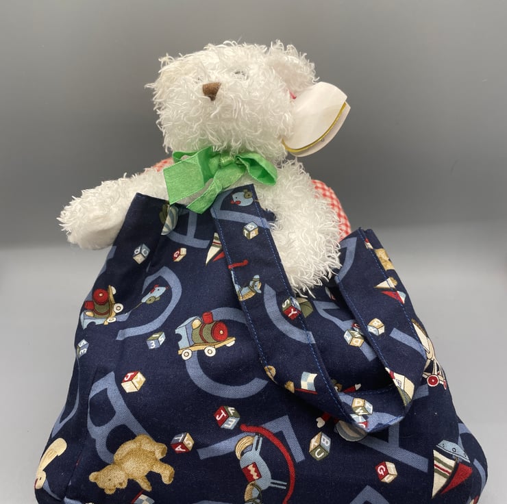 A small gift bag, made of a beautiful fun fabric, children’s toys and pale blue alphabet letters on a navy background lined with a royal blue fabric. Deep scarlet ribbon to close with a red button.