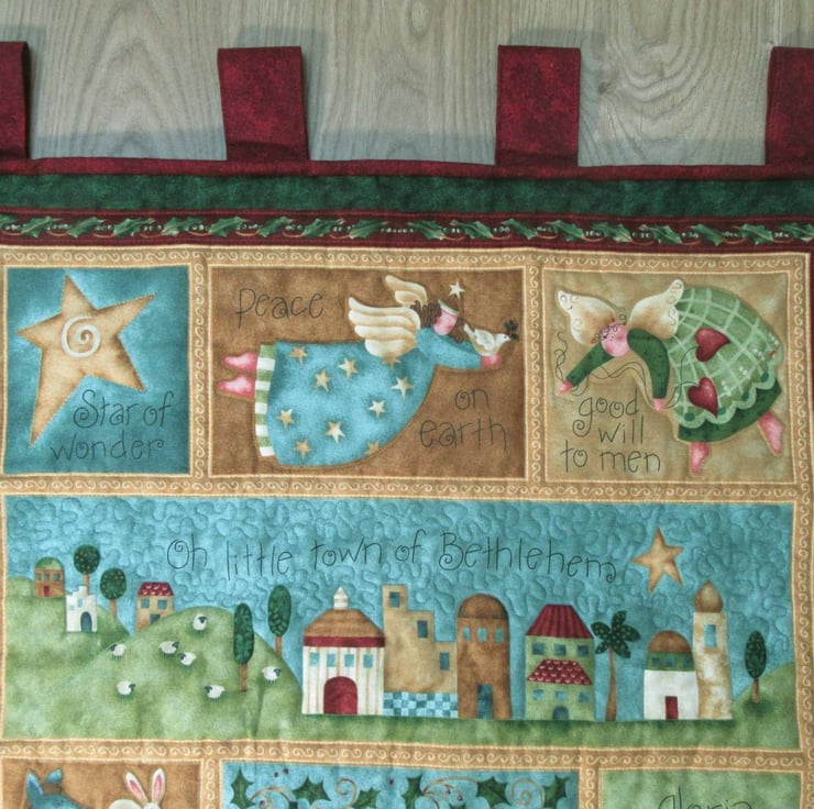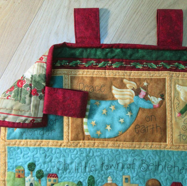 The Panel measures 23.5" wide x 42" long (60cm x 106cm). I have securely stitched four hanging tabs to the top edge of the hanging. Each tab is 3" (8cm) high - large enough to accommodate a curtain pole or a hanging rod (not supplied). I have also stitched pockets to the bottom corners of the back of the Panel. These may be used to hold another rod should you want to use one (not supplied).