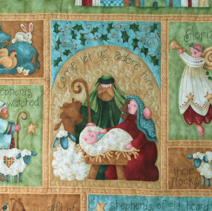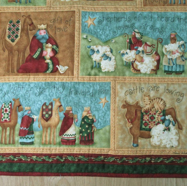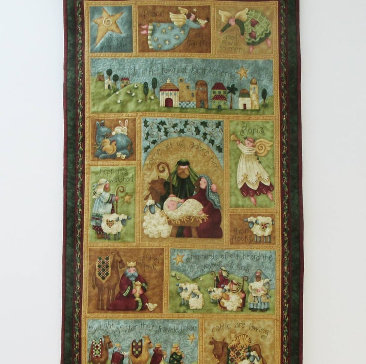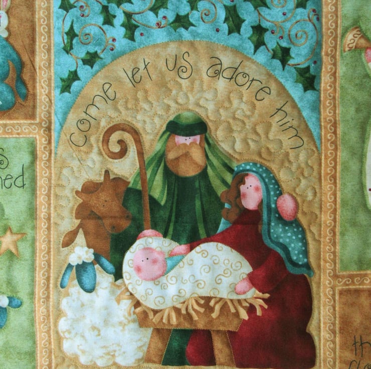 Beautiful rich hues capture the wonder of Christmas night. Peaceful images of the Holy Family, shepherds, kings, angels, domestic animals and the 'little town of Bethlehem' are depicted in the folk-style of Nancy Halverson.