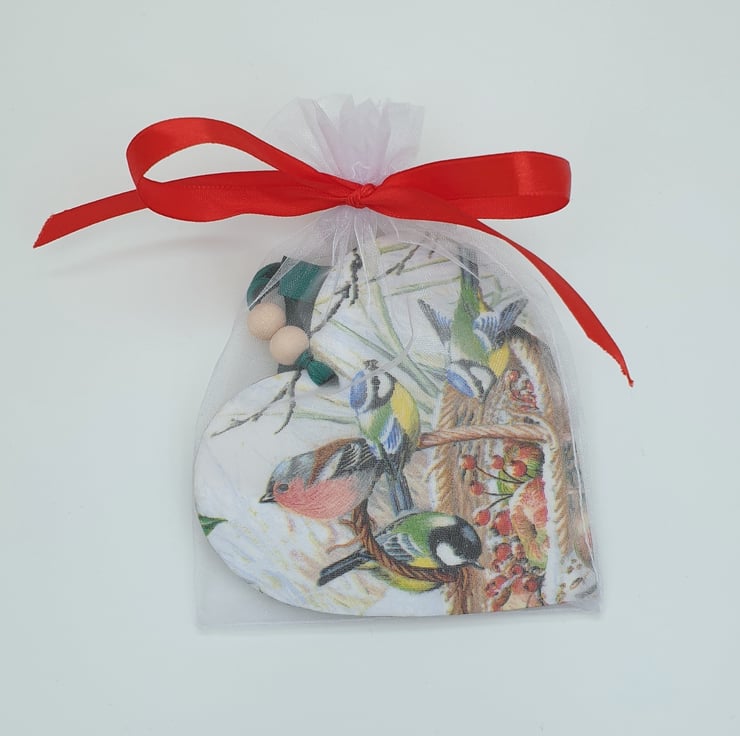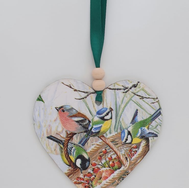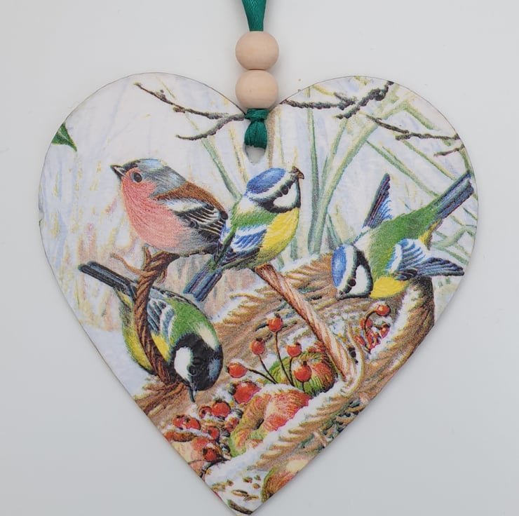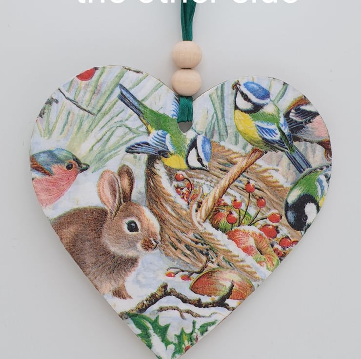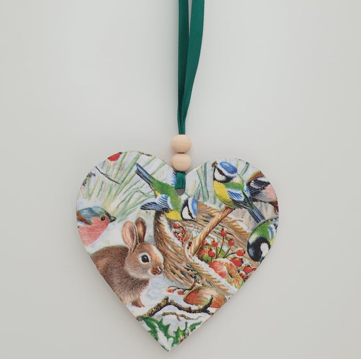 Double-sided garden birds, heart shaped, hanging decoration perfect for hanging in a window, from a handle or piece of furniture. This lovely wooden heart has been decoupaged with pretty garden birds feeding in the snow with a different design on each side, one of which also has a cute little bunny. The heart has been lovingly decoupaged, sealed, finished with 2 wooden beads and comes ready to hang with green satin ribbon. This lovely hanging decoration would make a lovely gift for a nature lover and comes prettily packaged in an organza bag finished with ribbon.