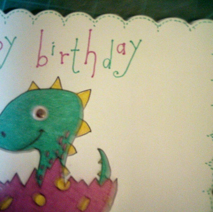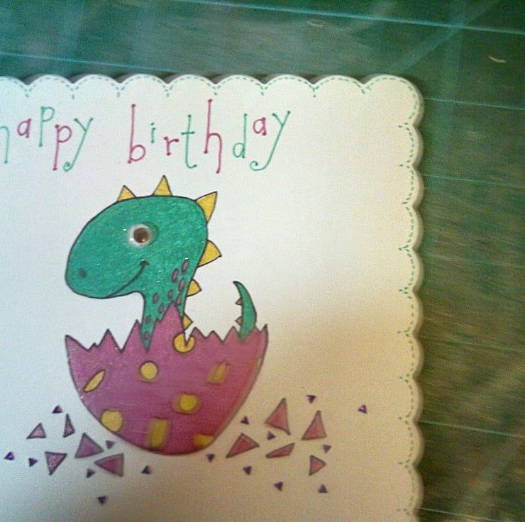 A completely handmade and uniquely designed card. Consisting of a baby dinosaur emerging from an egg. Hand drawn and coloured with gel pens. Drawn onto quality pristine white card. Embellished with purple triangle beads
