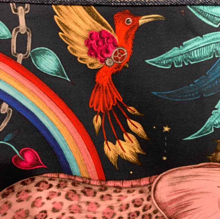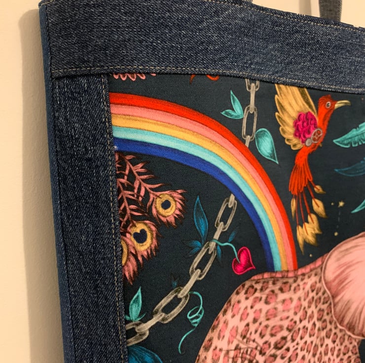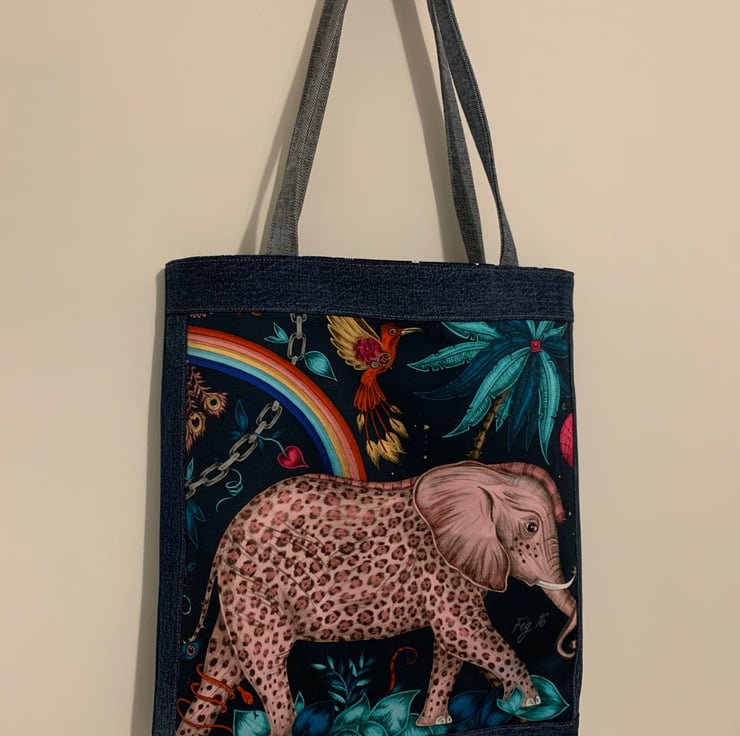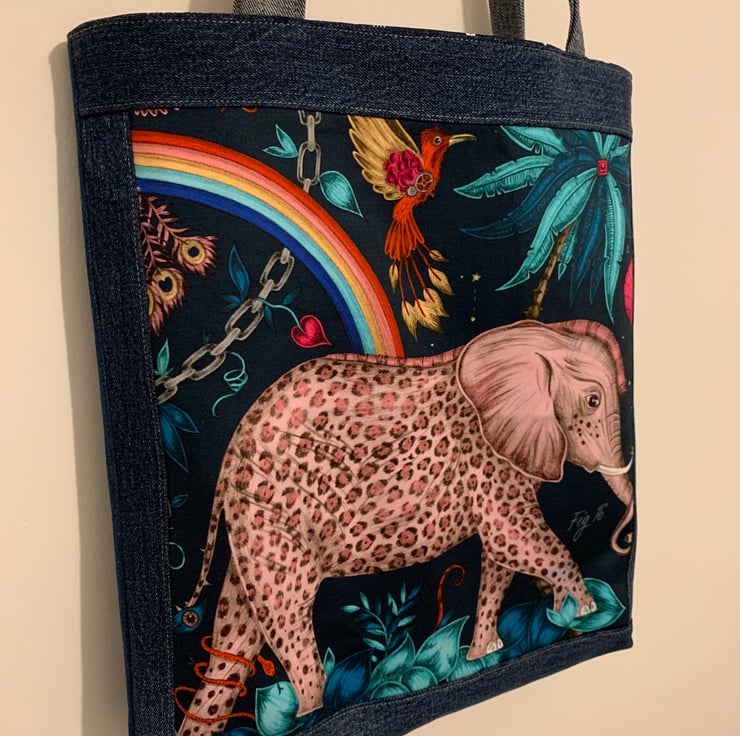 One of a kind tote bag made from Emma J Shipley Zambezi cotton fabric with new and reclaimed denim. The colourful elephant design with rainbows and birds is really eye catching.