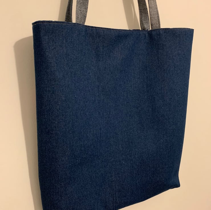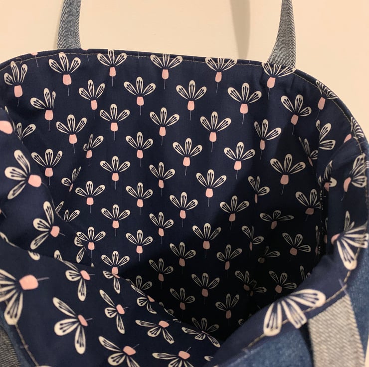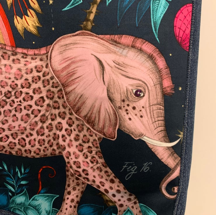 The elephant is framed with reclaimed denim from jeans and backed with new denim. The bag is fully lined with a pretty cotton print and has a layer of interfacing to give it structure.