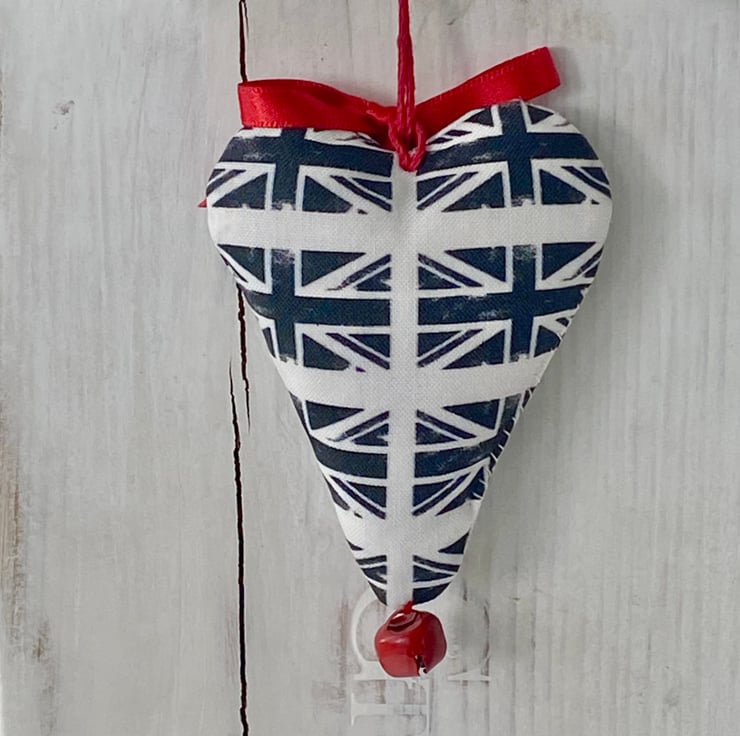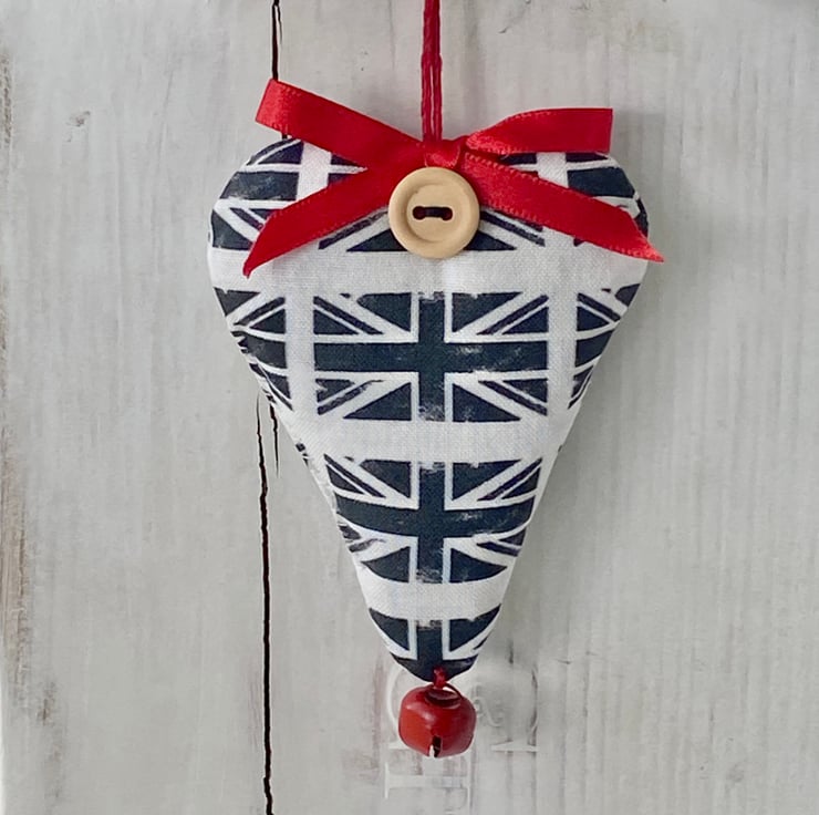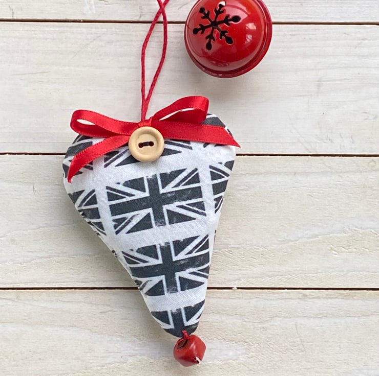 Monochrome Union Jack cotton fabric heart, finished with a bright red ribbon bow, a red jingle bell and red natural hemp twine hanging ties. Generously filled with fragrant Hampshire lavender.