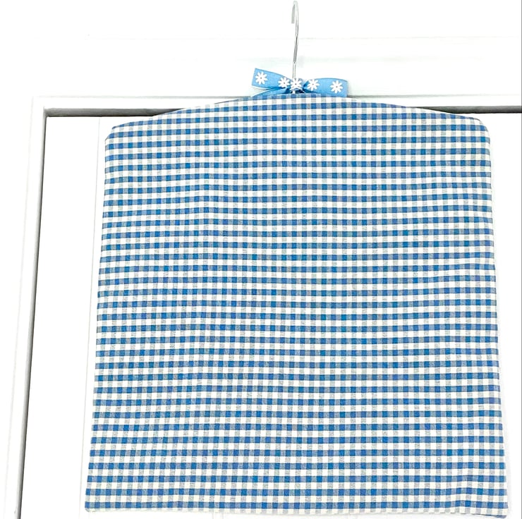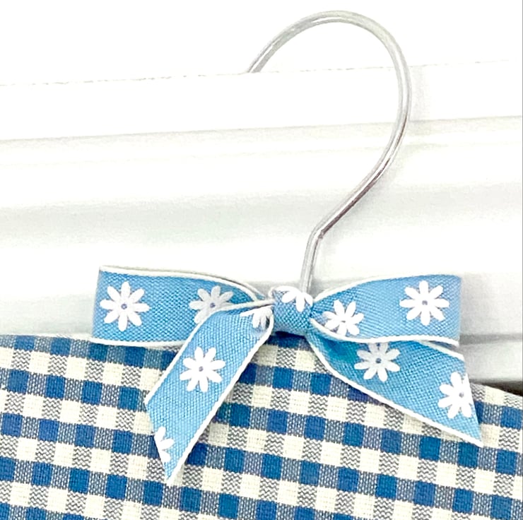 In blue and white superior quality woven cotton, generously sized, with a beechwood coathanger for easy use and storage, and with 'Pegs' embroidered in blue on the front and finished with a blue daisy ribbon bow too.