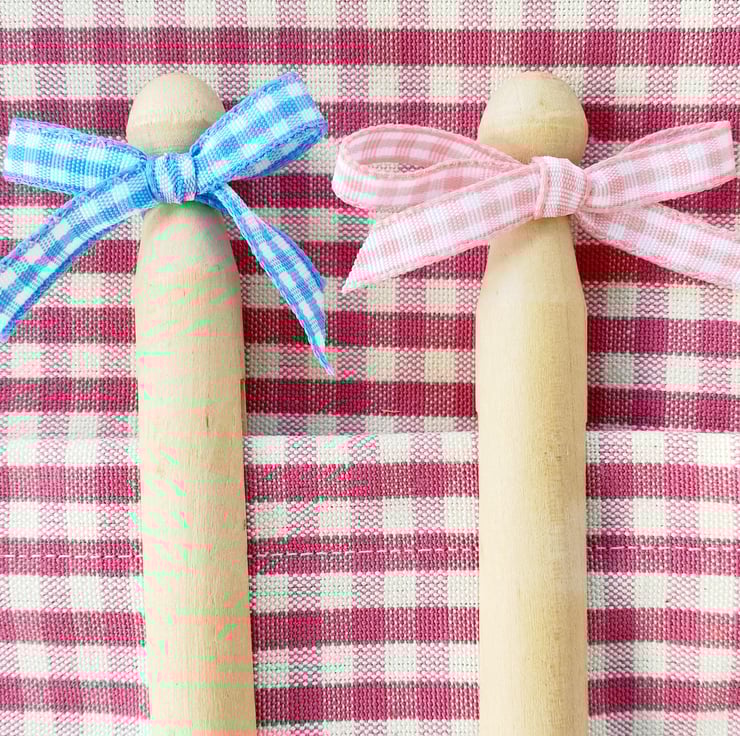 Includes a sweet dolly peg with blue gingham ribbon trim.