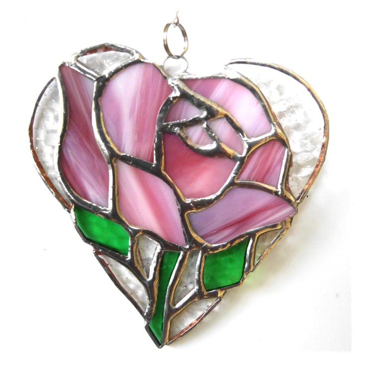 A full pretty pink rose in a heart, entirely handmade by me to my own Joysofglass design.
