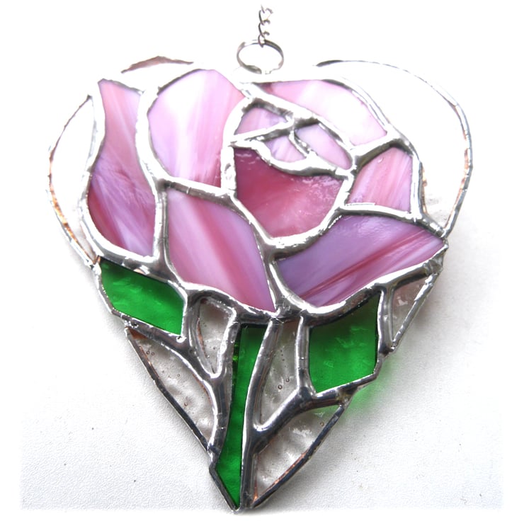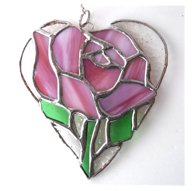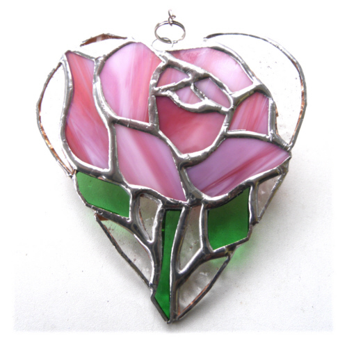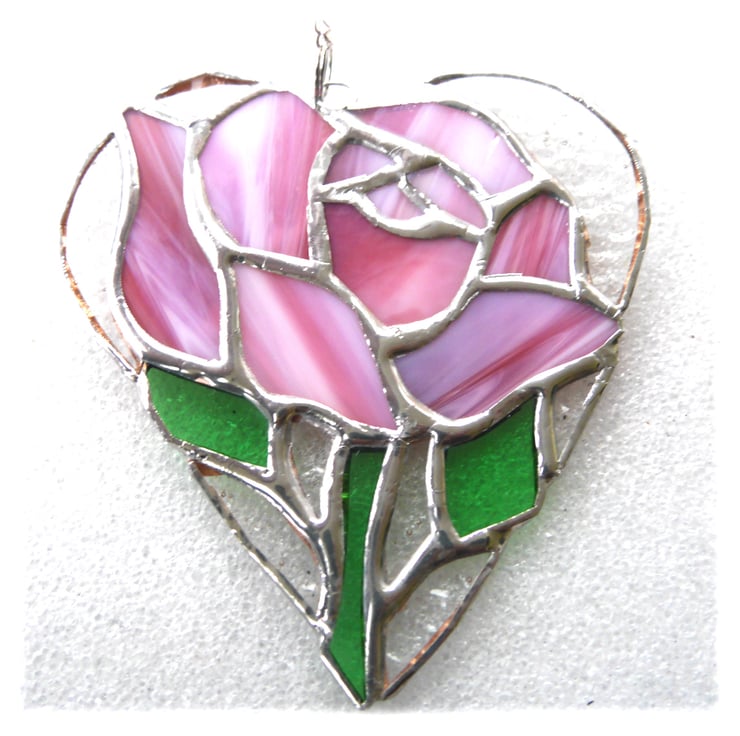 A full pretty pink rose in a heart, entirely handmade by me to my own Joysofglass design.