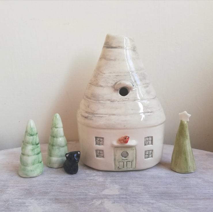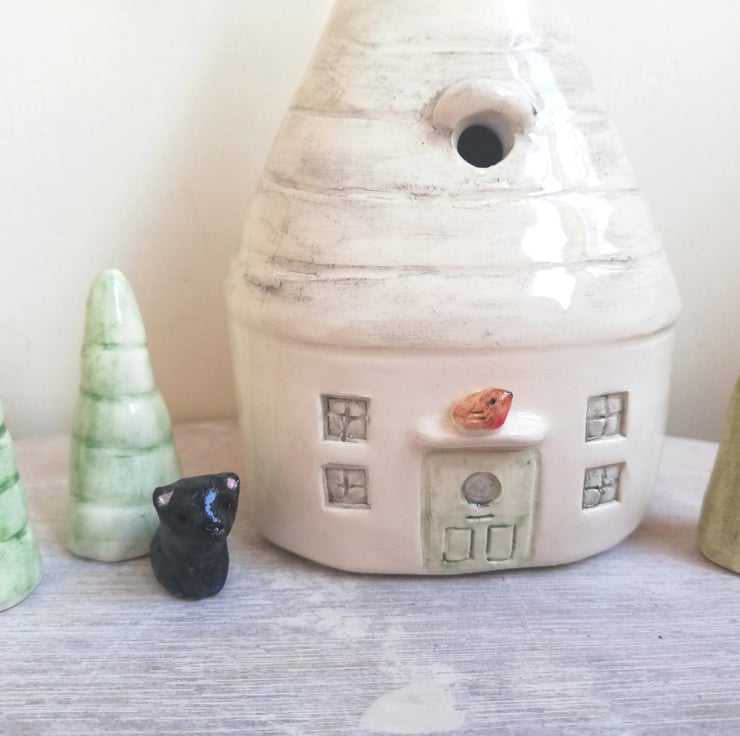 I threw this little tealight house by hand on my potter's wheel then altered it to form the shape and windows and doors. The tiny robin red breast was hand modelled and perches over the door. Once dry it was bisque fired and hand painted before glaze application and final firing.