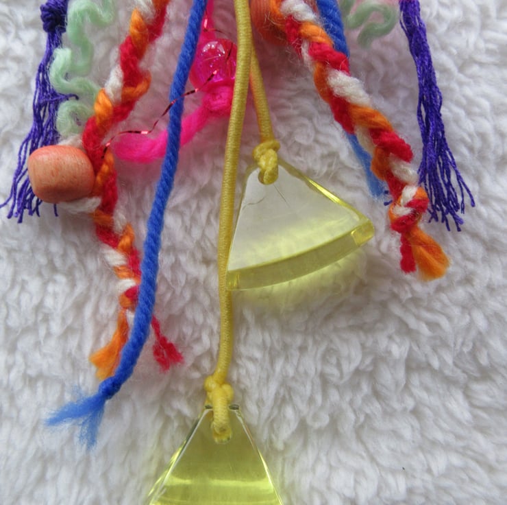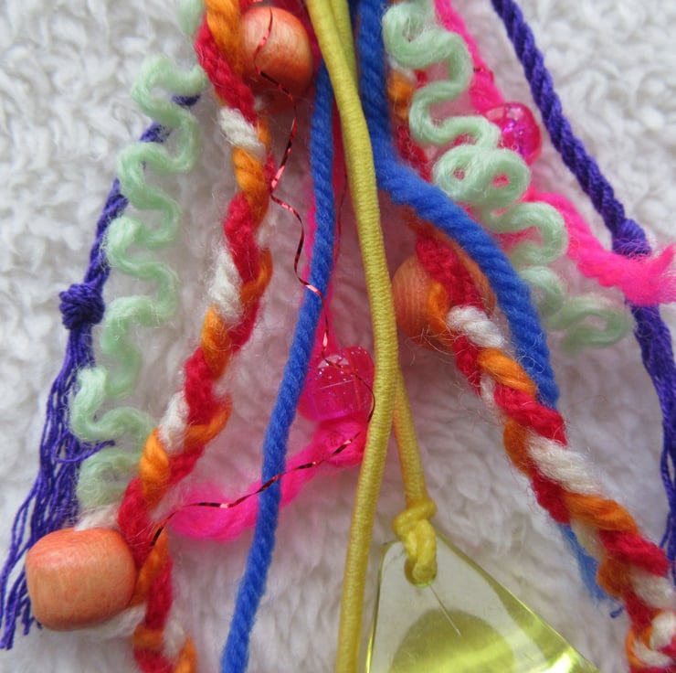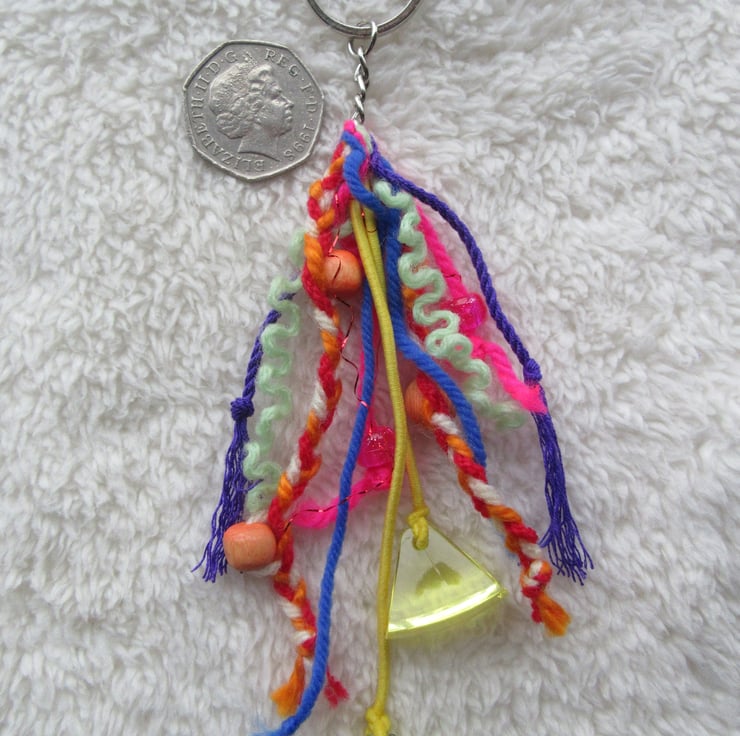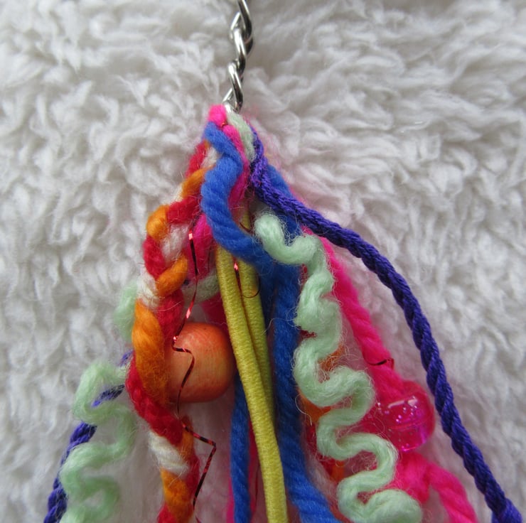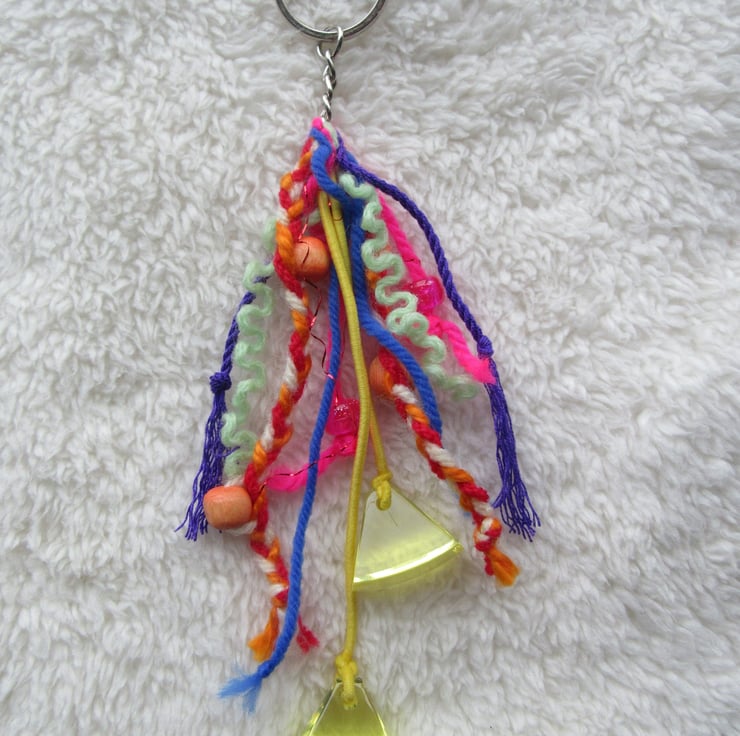 This one is made from purple, red, orange, yellow, blue, pink, and green yarn, with pink and orange beads strung onto it, and also yellow plastic triangle beads. It is all attached to a metal keyring.