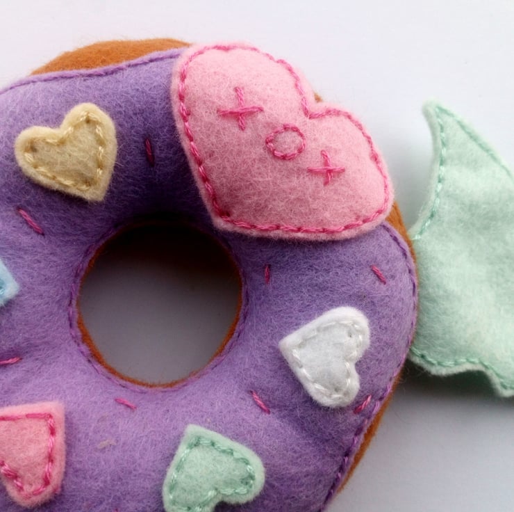 Made from wool felt, this donut plush features purple icing, and decorated with pastel coloured candy hearts in pink, white, yellow, blue and green