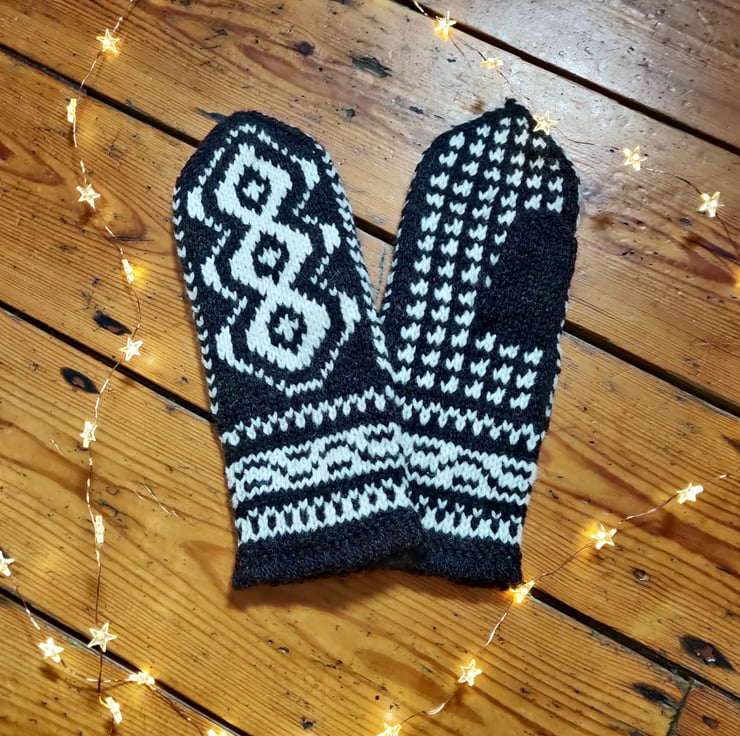 Dark brown and white wool mittens in fairisle pattern. Soft and not itchy! They make a great Christmas present... Only one such pair available this year.