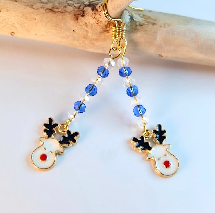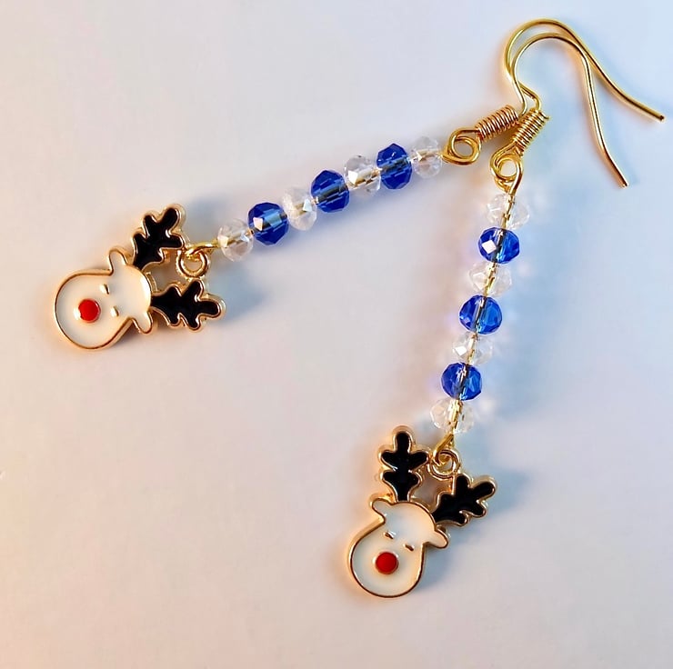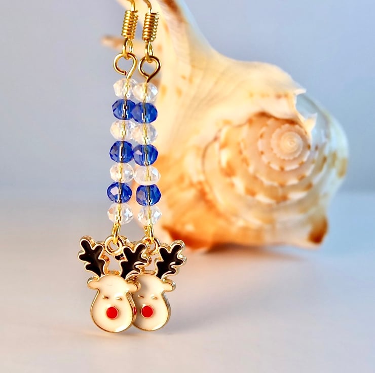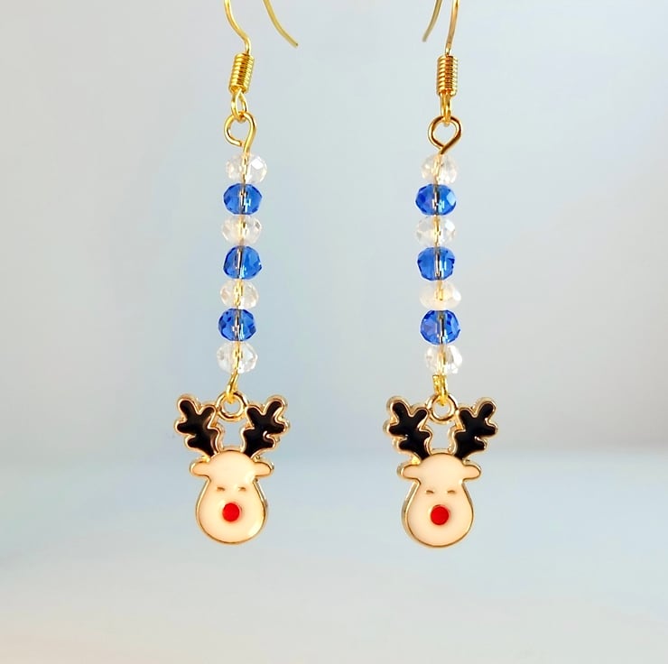 Sweet little reindeer charm earrings enhanced with sparkly faceted clear and blue glass beads.