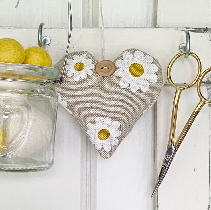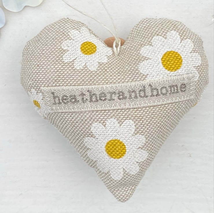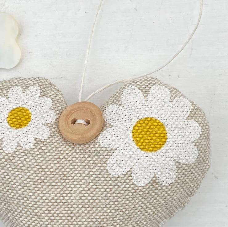A beautifully shaped heart decoration, plump with either super scented lavender or with fluffy toy grade stuffing, and featuring fresh yellow and white daisies front and back. Each heart is hand finished with a little round wooden button and with natural hemp twine hanging ties.