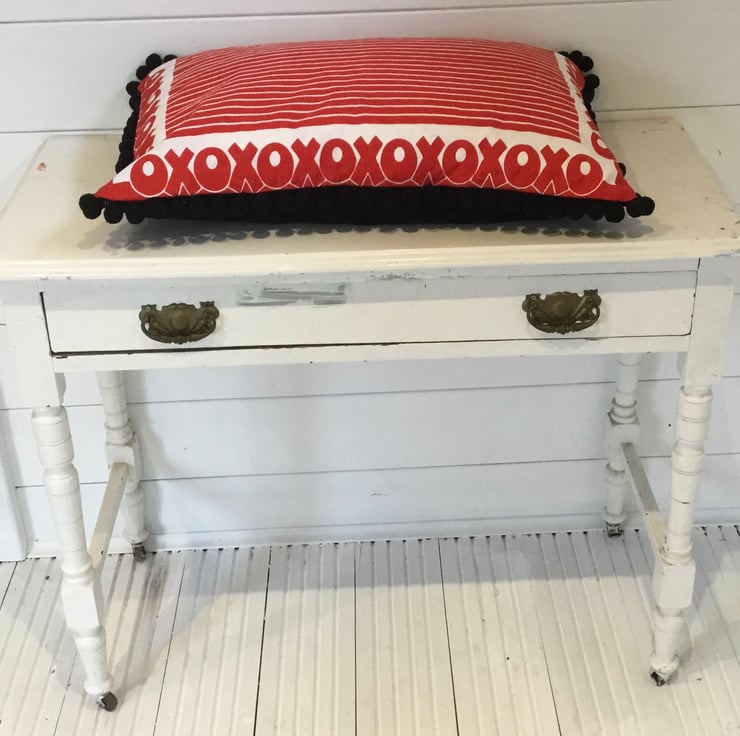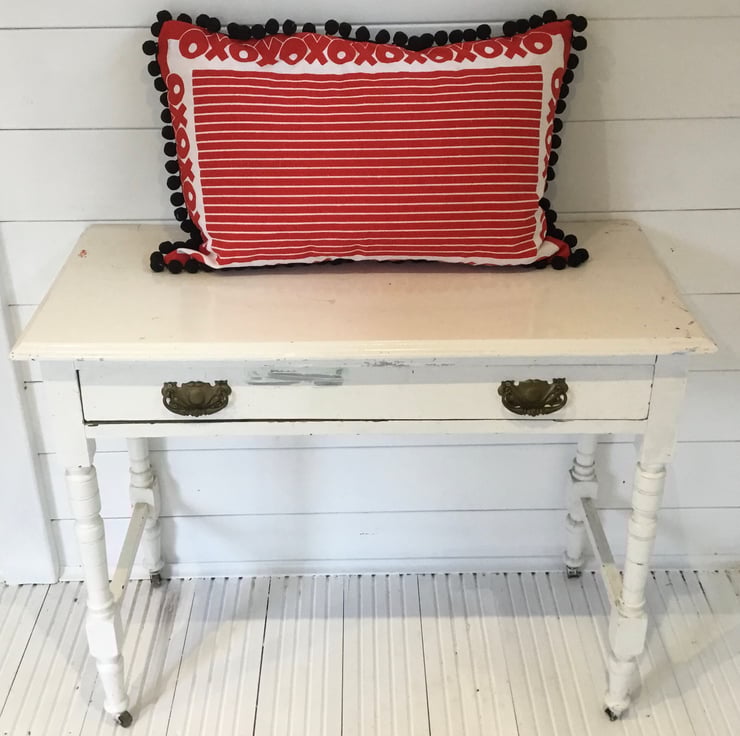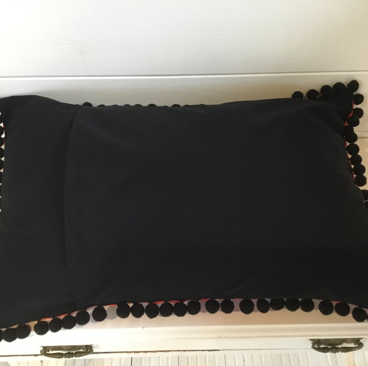 Large Oxo print cushion trimmed with extra large black pompom trim. Such an iconic print using vintage and original Oxo advertising fabric.