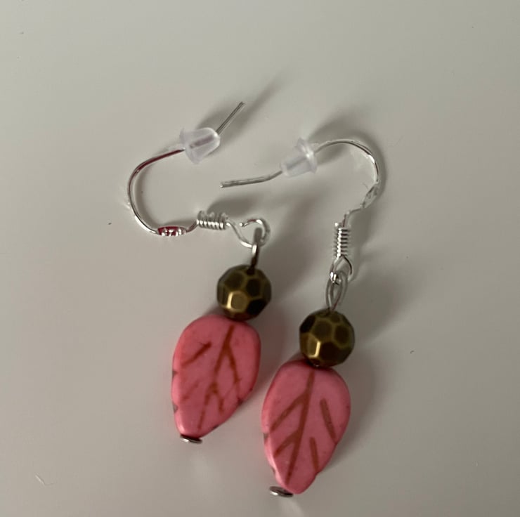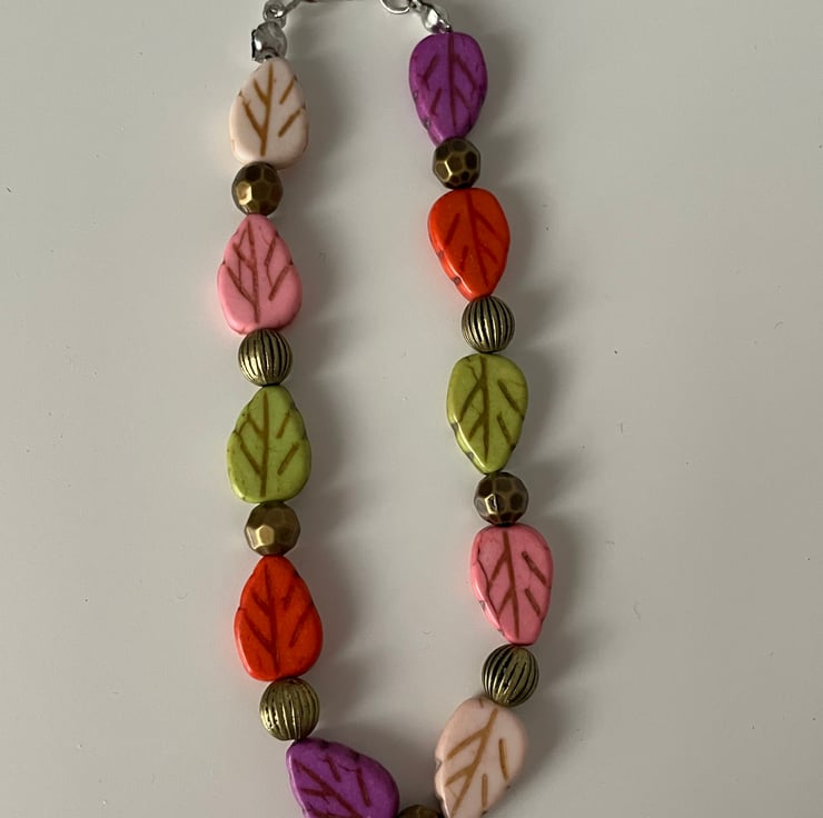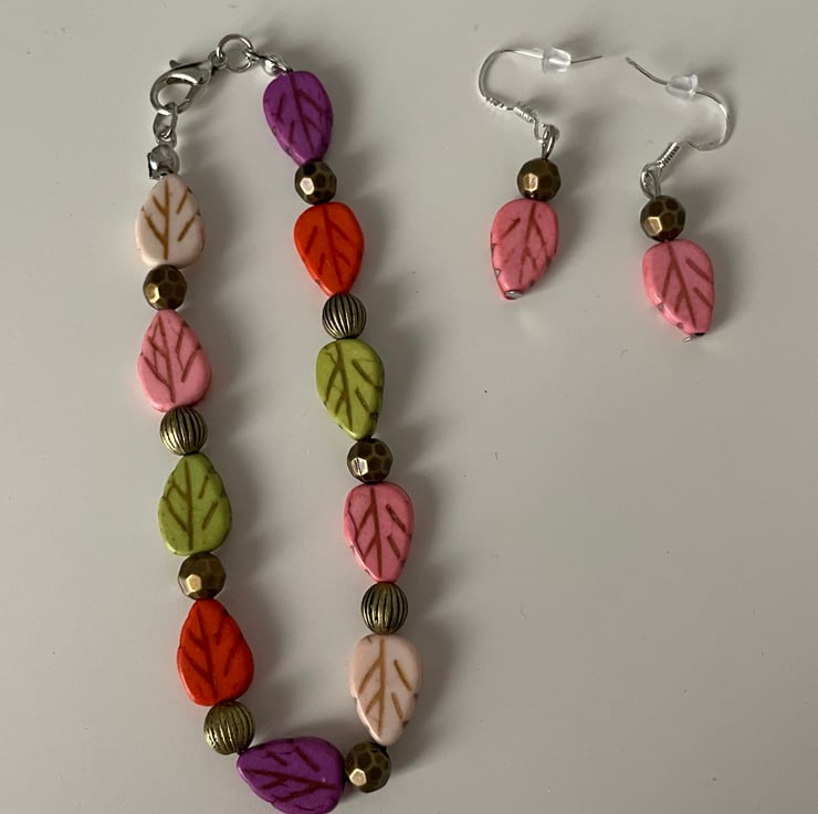 Handmade bracelet in various autumnal colour leaves with matching earrings. Fastens with a silver-plated lobster clasp.