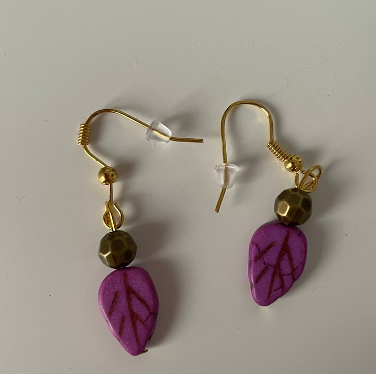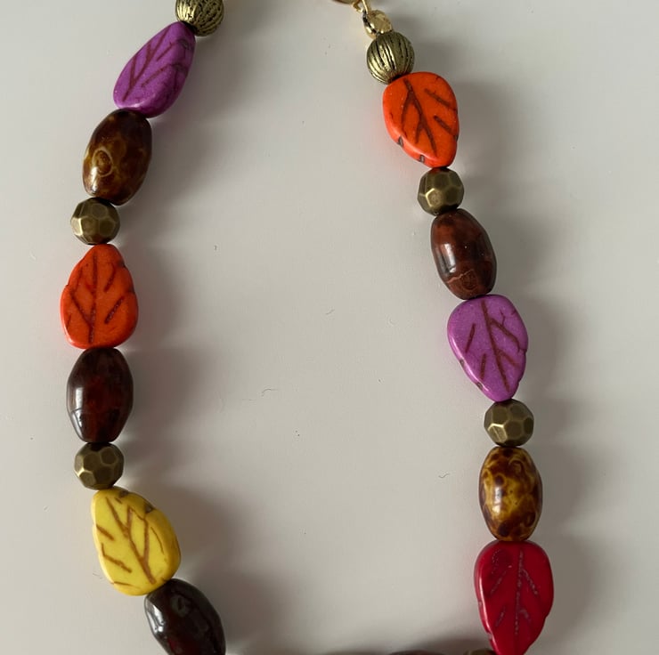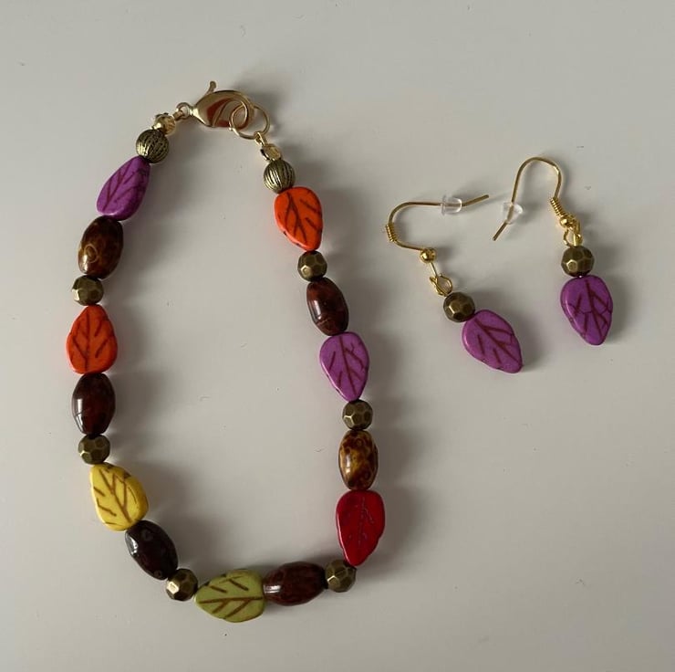 Handmade bracelet in various autumnal colour leaves with matching earrings. Fastens with a gold-plated lobster clasp.
