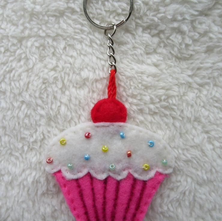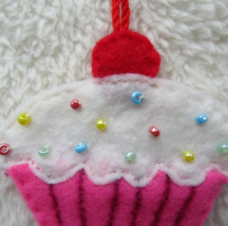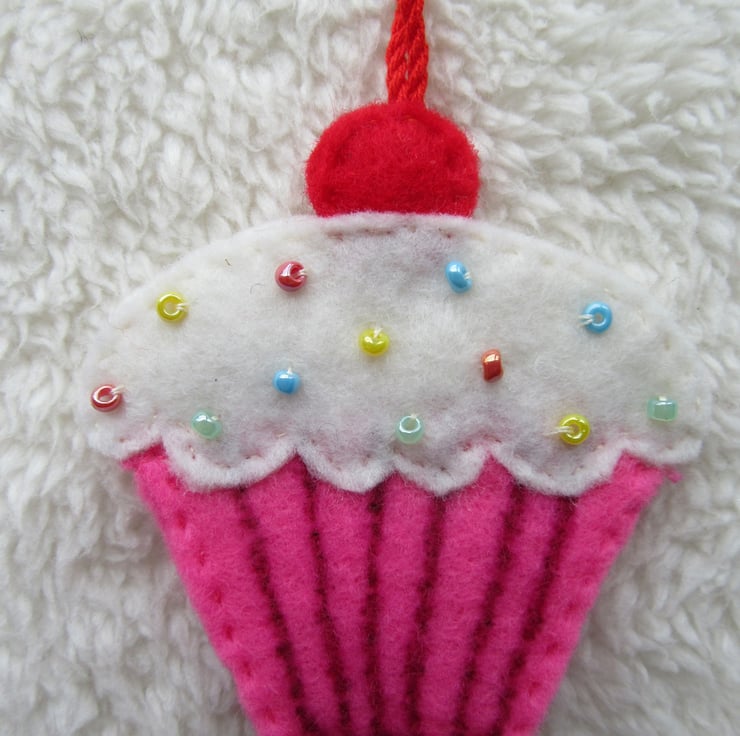 The cake is made from pink felt, with white felt icing and hand-stitched tiny beads for the sprinkles, and a red felt cherry on top. It is the same on both sides. All the felt is hand stitched.
