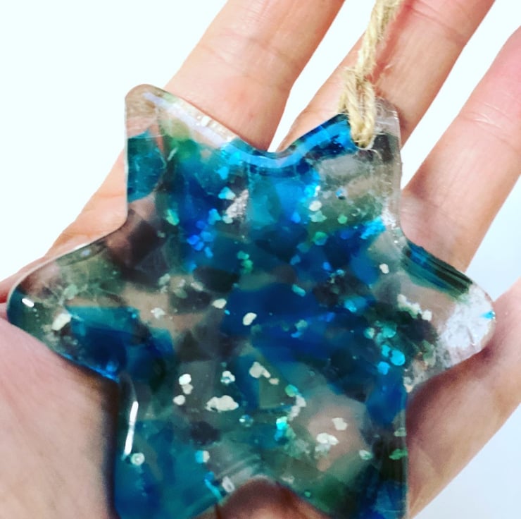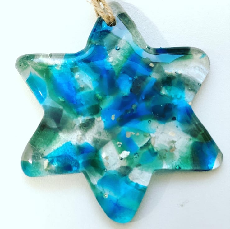 Gorgeous blue and green recycled glass cast star with silver flakes . Perfect Christmas star decoration or any other time of year . A lovely glass star would make a perfect gift at Christmas or any time you want to tell someone your a star . Approximately 4 inch diameter and 1/2 inch thick . Drilled and strung with jute .