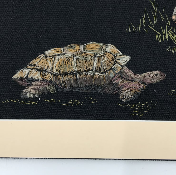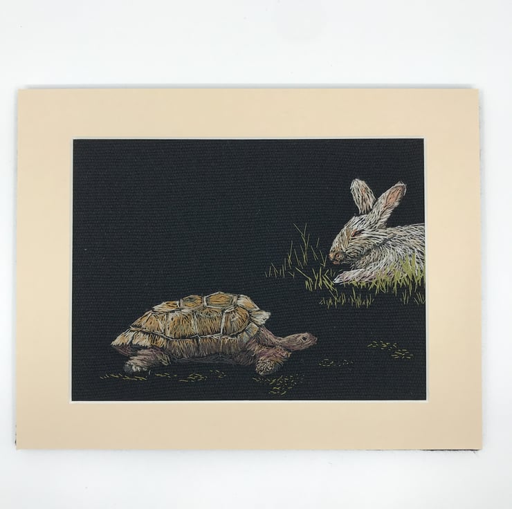 This is one of my unique hand embroidery pictures based on fairy tales. This represents the story of the tortoise and the hare. It is entirely freehand and I enjoy building up the layers with embroidery.