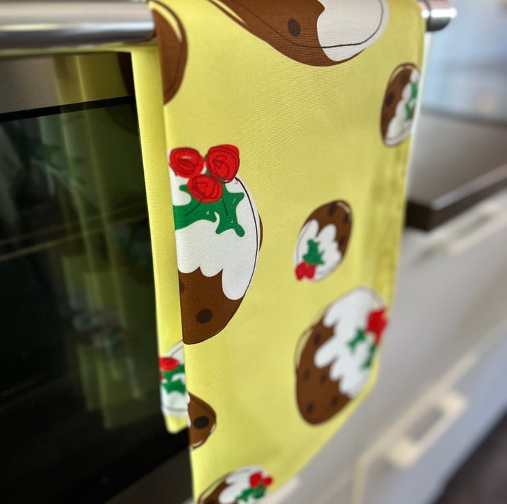 I've got for you a wonderful super fun Christmas pud tea towel, use it for drying up, put it in a frame, cover a table, make into a hair tie, I don't know do what you want to do with it but it will cheer up any household chore!