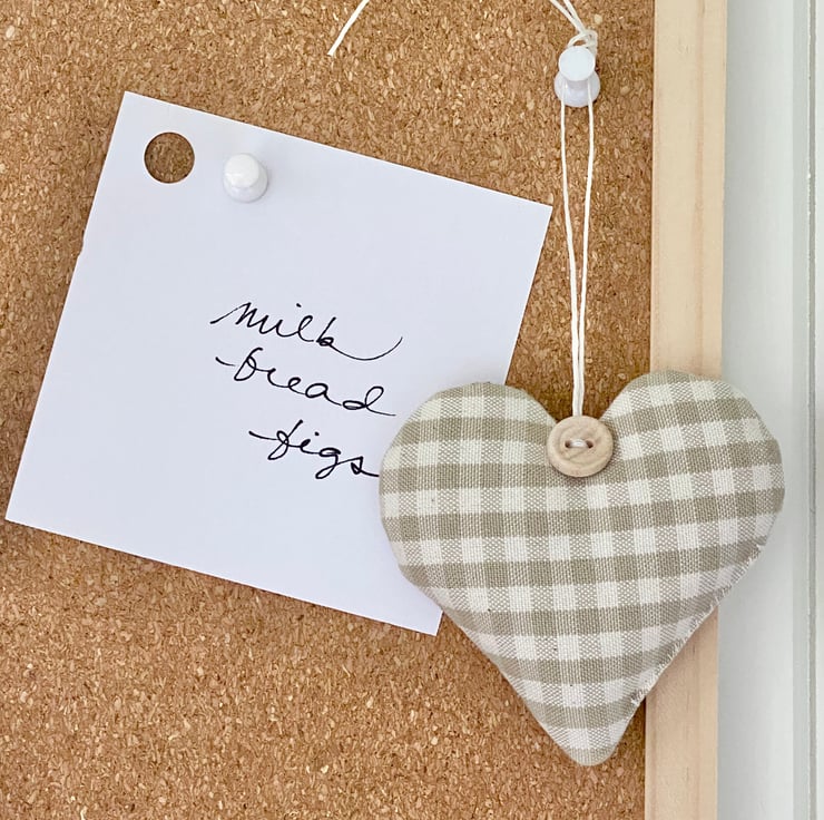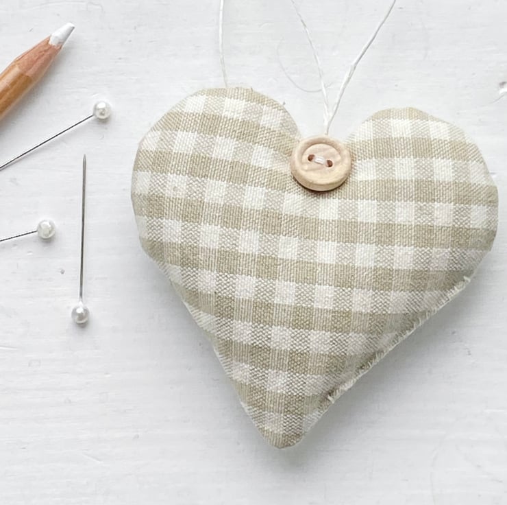 A beautifully shaped taupe gingham heart decoration, fragrant with Hampshire lavender or plump with toy-grade stuffing. The fabric is a superior quality woven cotton with a lovely weighty feel. Each heart is hand finished with a little round wooden button and with natural hemp twine hanging ties.