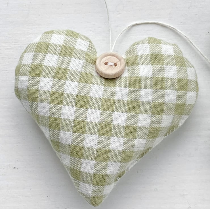 A beautifully shaped sage green gingham heart decoration, fragrant with Hampshire lavender or plump with toy-grade stuffing ... The fabric is a superior quality woven cotton with a lovely weighty feel. Each heart is hand finished with a little round wooden button and with natural hemp twine hanging ties.