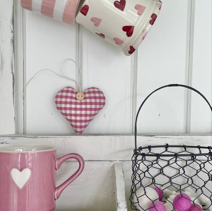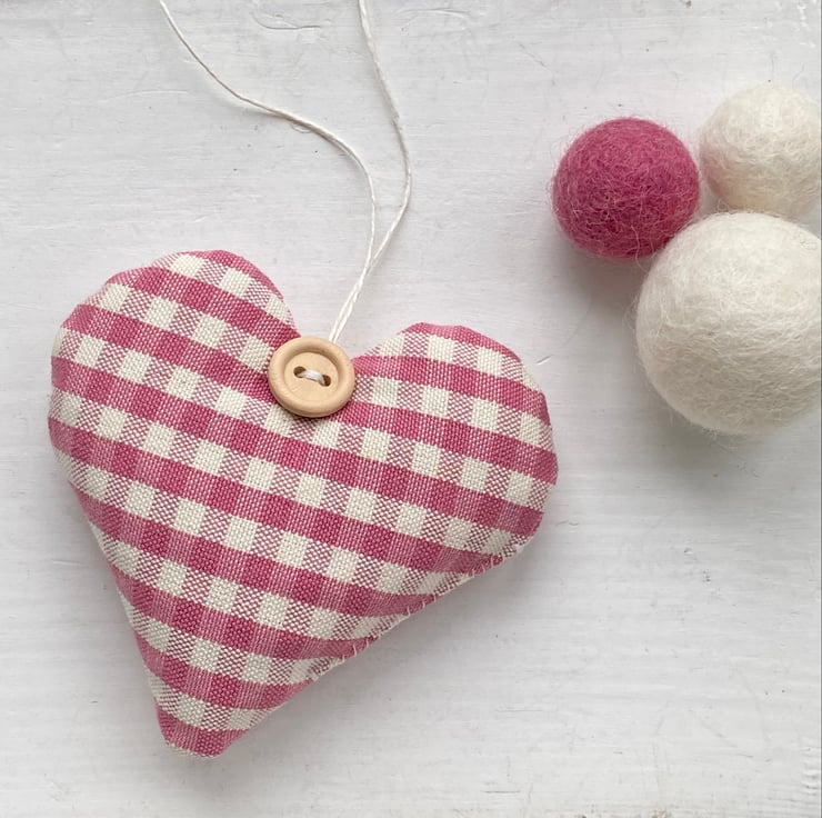 A beautifully shaped rose pink gingham heart decoration, fragrant with Hampshire lavender or plump with toy-grade stuffing. The fabric is a superior quality woven cotton with a lovely weighty feel. Each heart is hand finished with a little round wooden button and with natural hemp twine hanging ties.